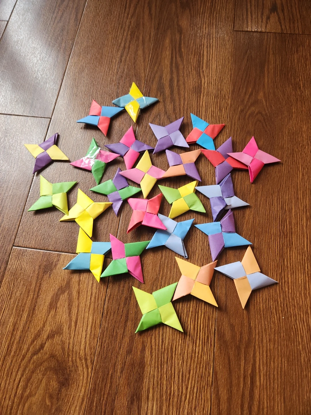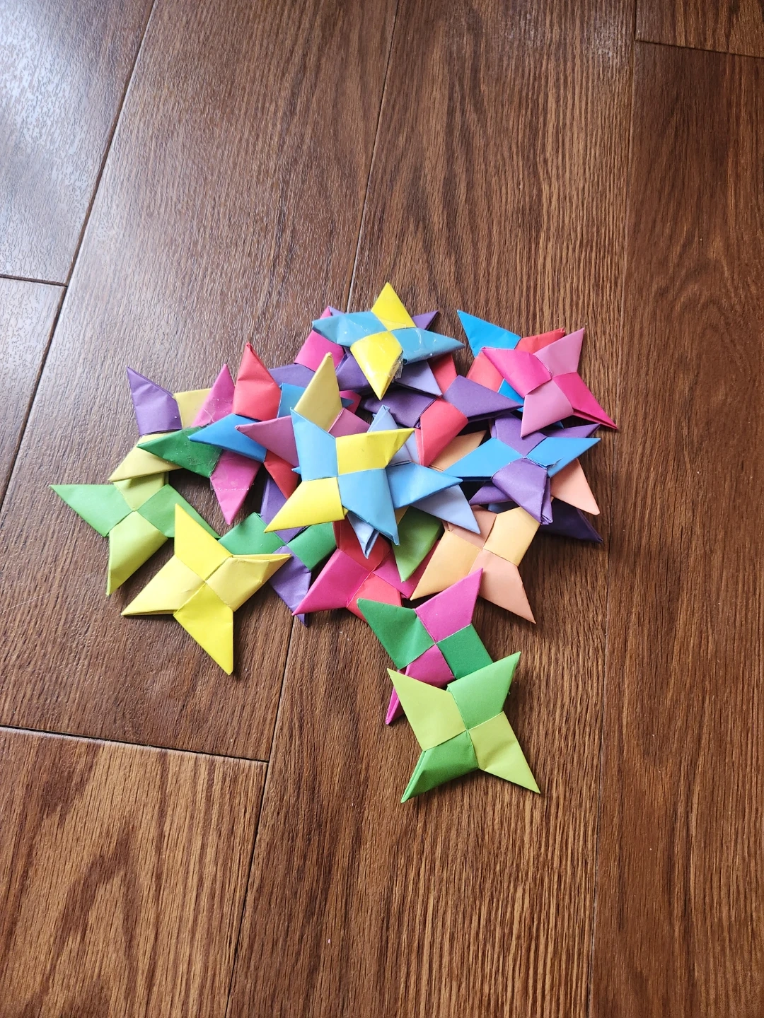 24 paper origami shurikens good for pretend play or just as a decoration. (Picture only has 13 because I haven't actually taken new pictures but there are 24)