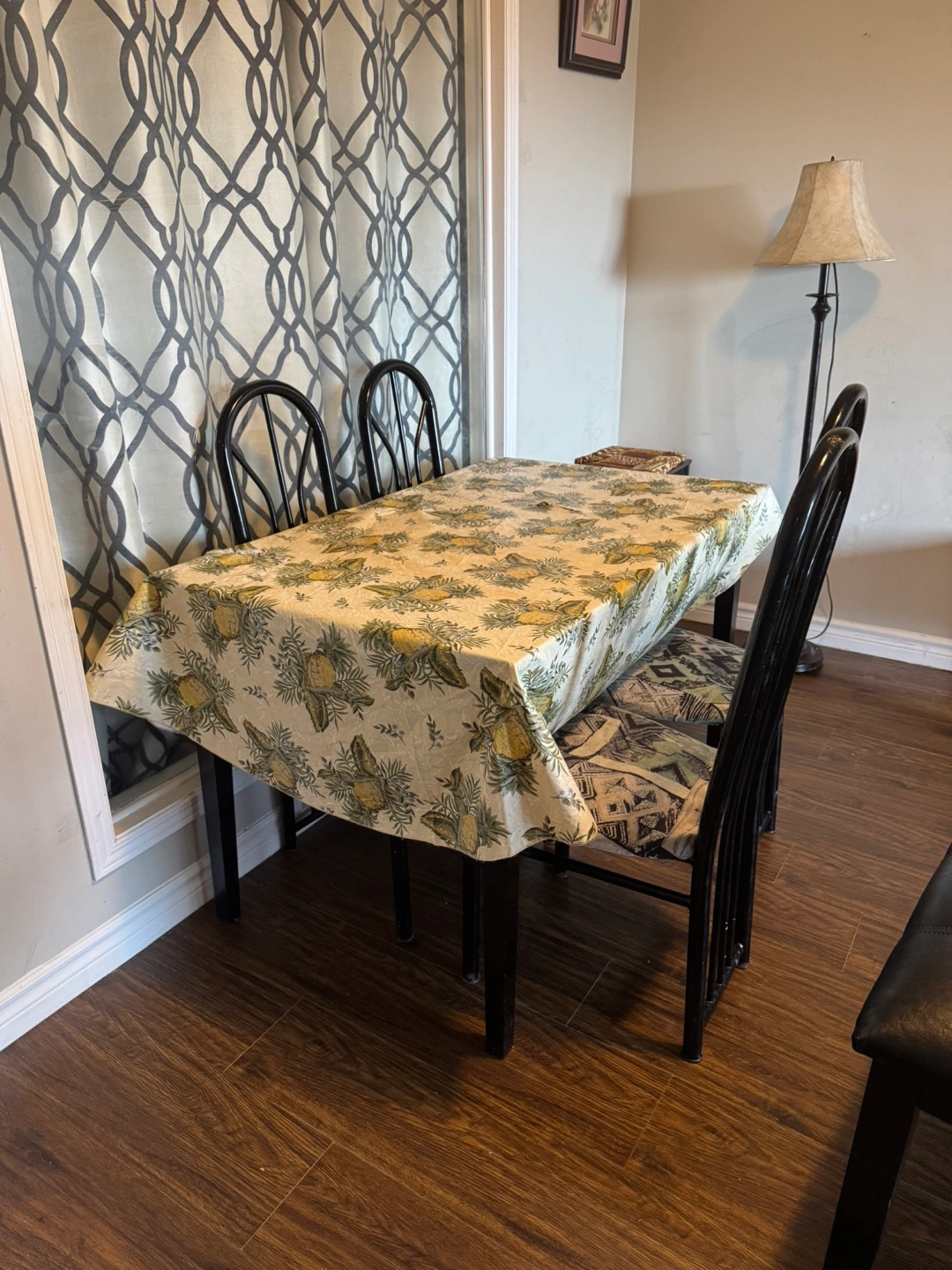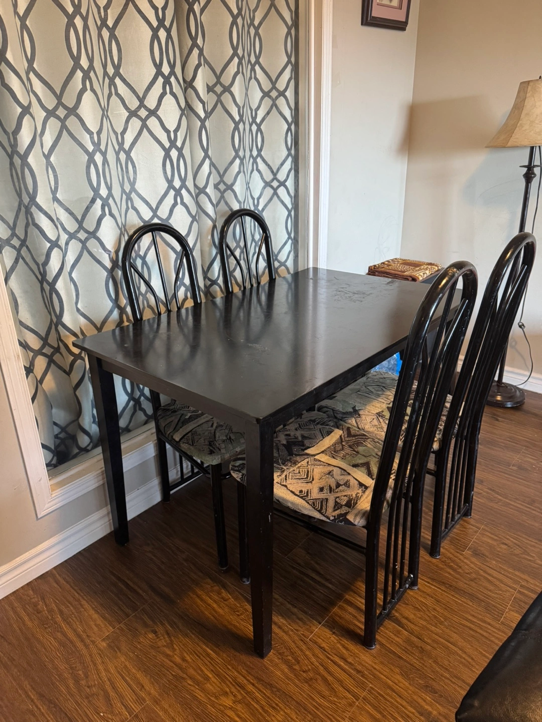 Selling a dining table with four chairs. It's a great set for a small dining area or kitchen. The table is a good size for everyday meals or entertaining guests. Chairs have a unique design.