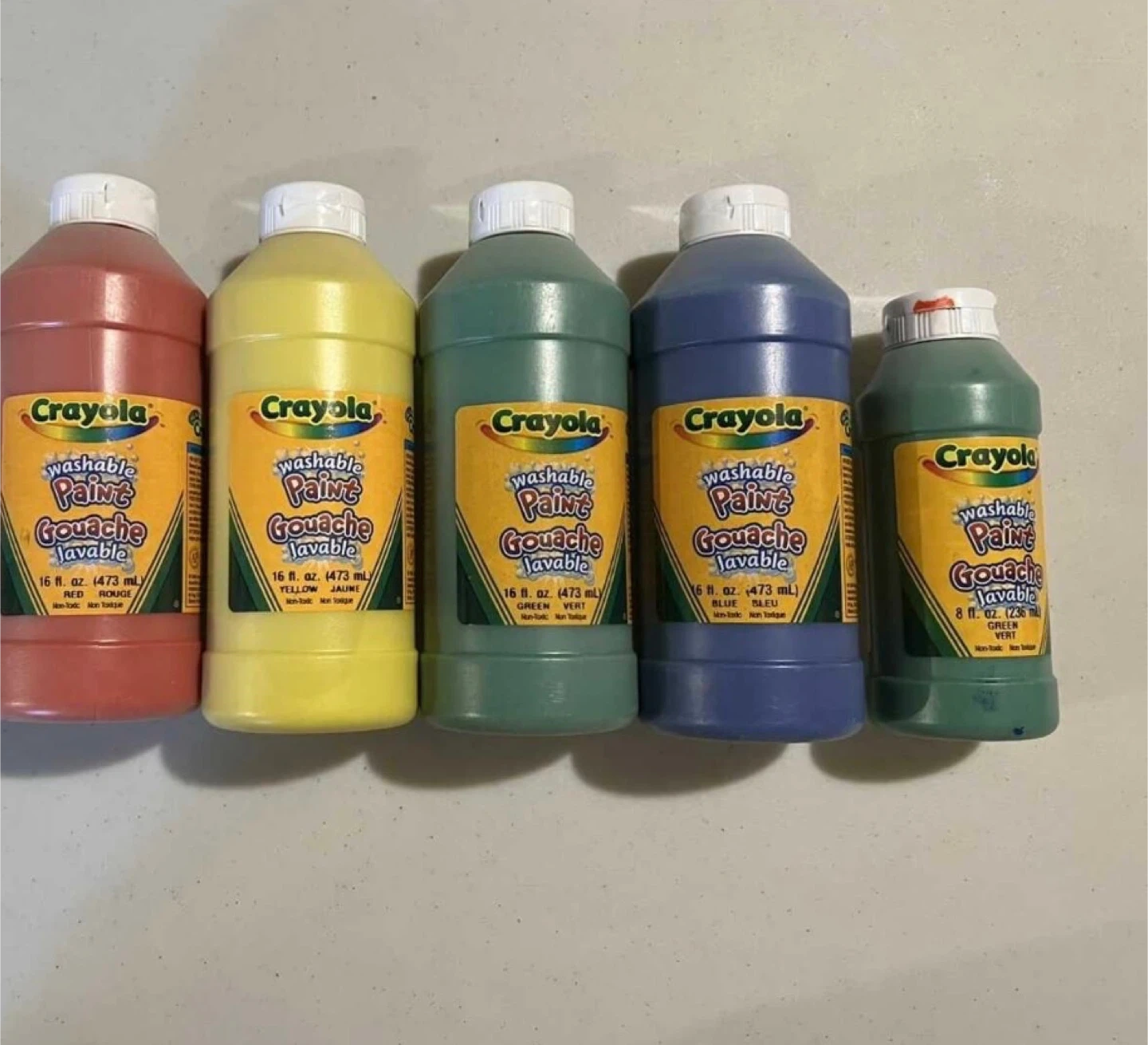 A set of Crayola washable gouache paints in various colours. Includes 16 fl. oz. bottles of red, yellow, green, and blue, plus an 8 fl. oz. bottle of green. All paints are non-toxic. This paint is washable and easy to clean up!