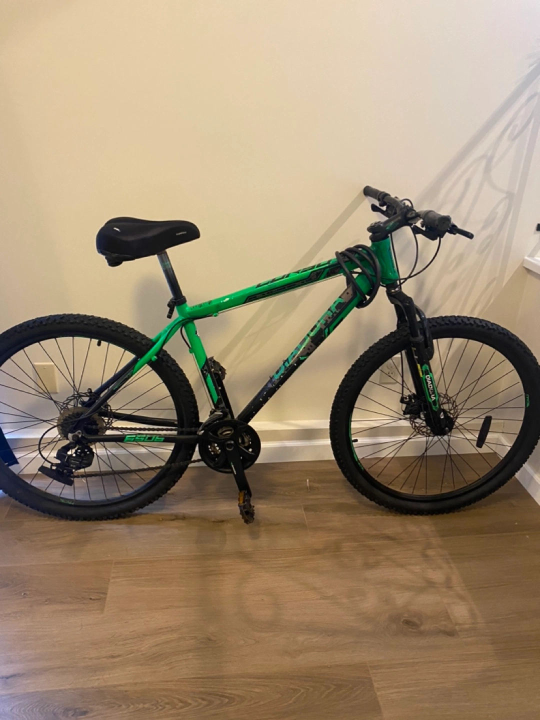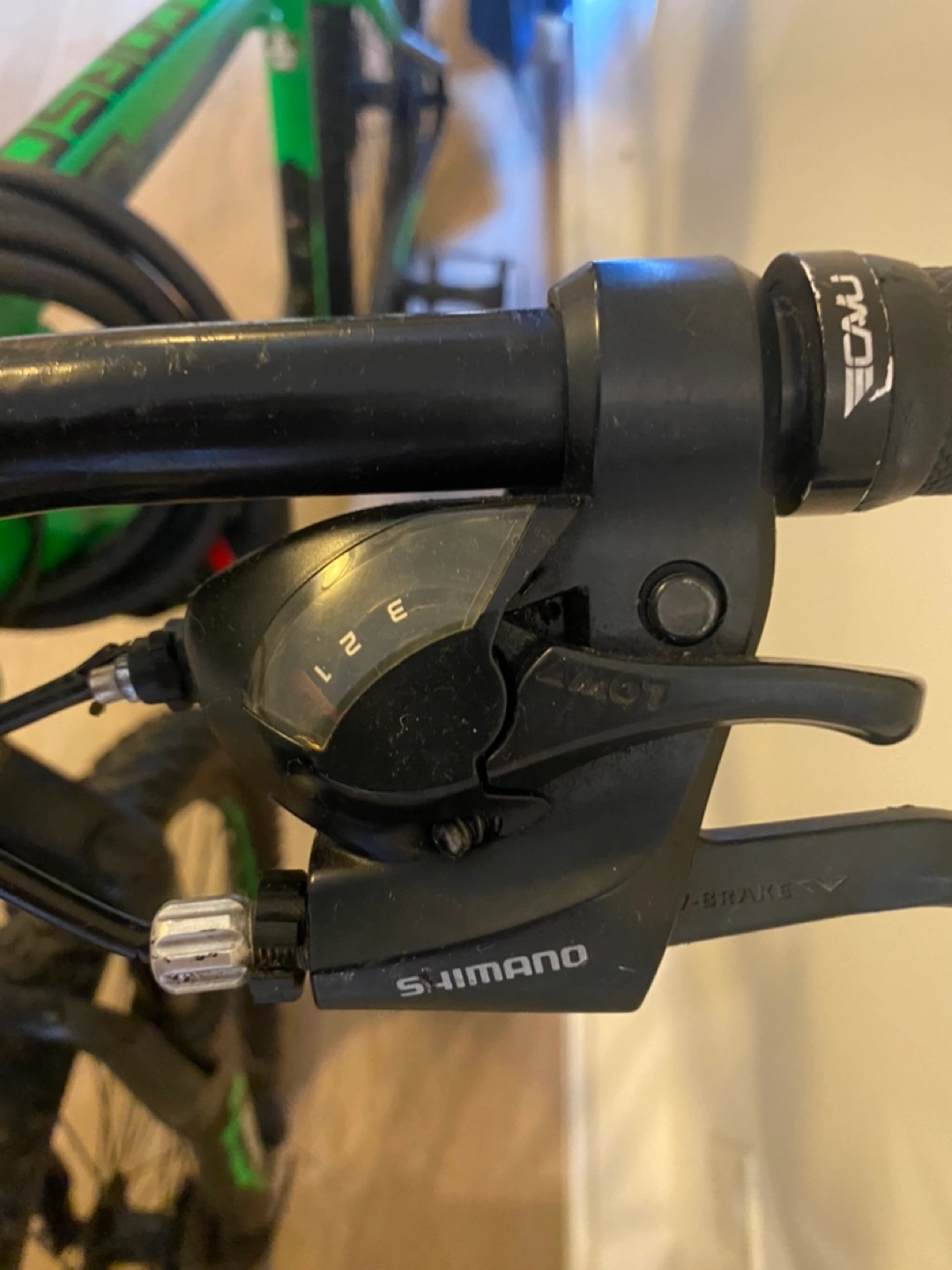 10Green and black mountain bike with Shimano gears. Rear brake needs fixing. 100 obo.