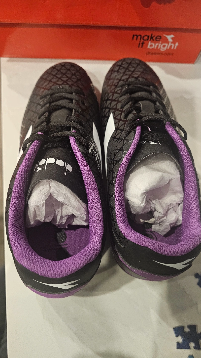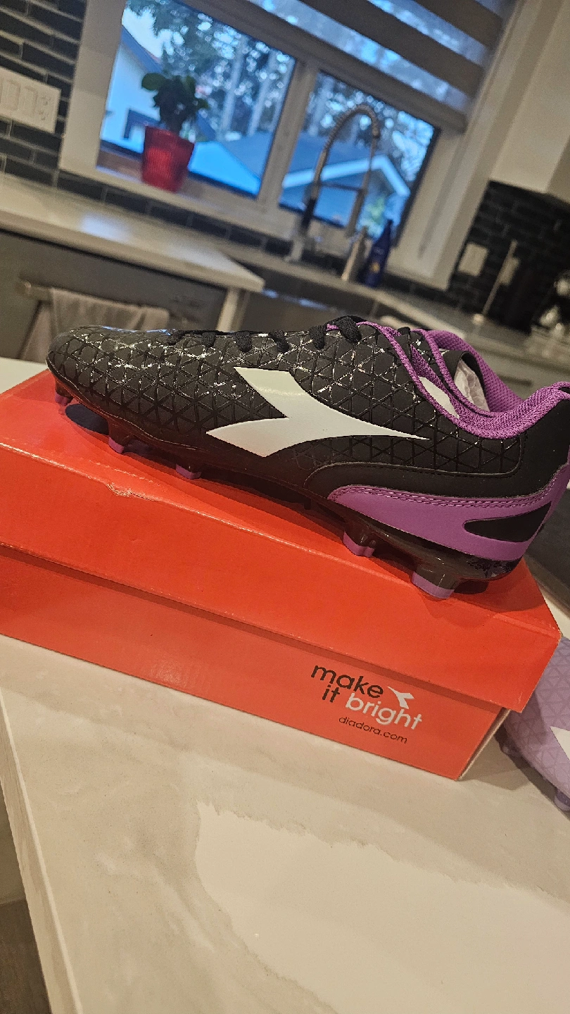 These Diadora soccer cleats are in great shape and ready for the field! They're a size 9 and come with the original box. The cleats feature a stylish black and white design with purple accents. Perfect for soccer star!