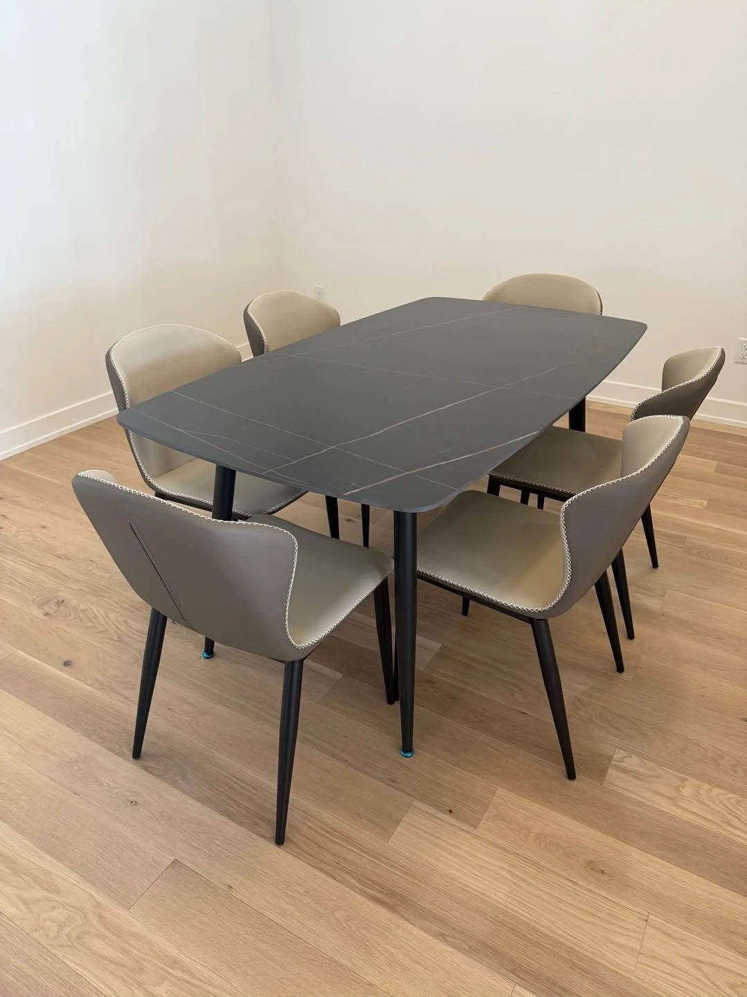 This contemporary dining set includes a sleek rectangular table and six upholstered chairs. The table features a dark, stone-like surface with subtle line detailing and black metal legs. Chairs are upholstered in a neutral-toned fabric with decorative stitching and matching black metal legs. It's suitable for seating up to six people comfortably. This set is great for family dinners or entertaining guests.