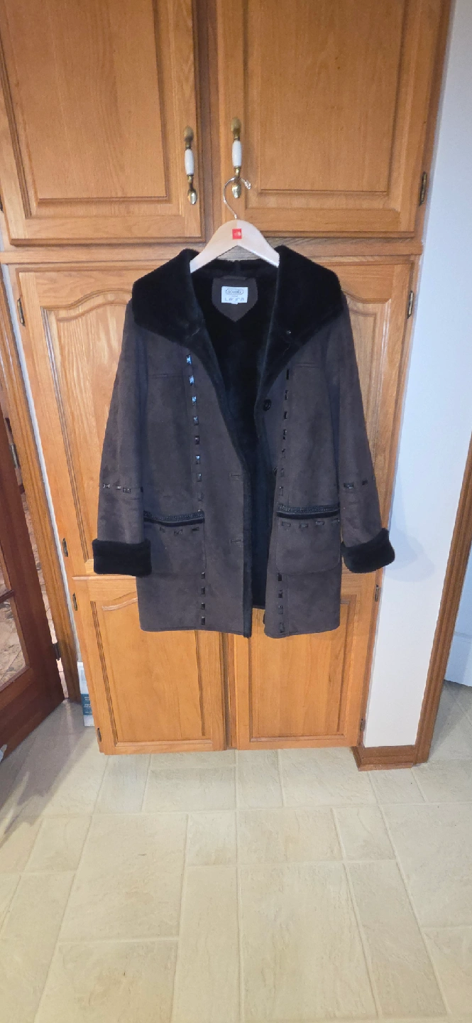 10A cozy Diamo & Co winter coat in a lovely shade of brown. It features a black faux fur collar and cuffs, adding a touch of elegance and warmth. Perfect for those chilly Canadian days!