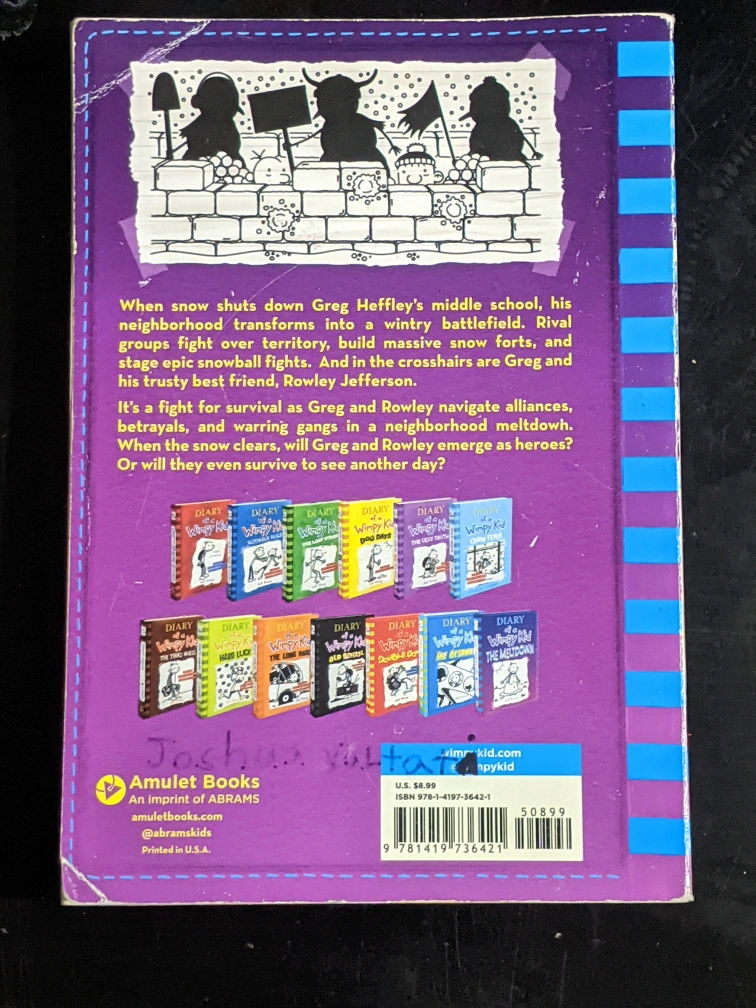 Selling "Diary of a Wimpy Kid: The Meltdown" by Jeff Kinney! It's a fun read about Greg Heffley's adventures when his neighbourhood transforms into a wintry battlefield. Great for kids and fans of the series