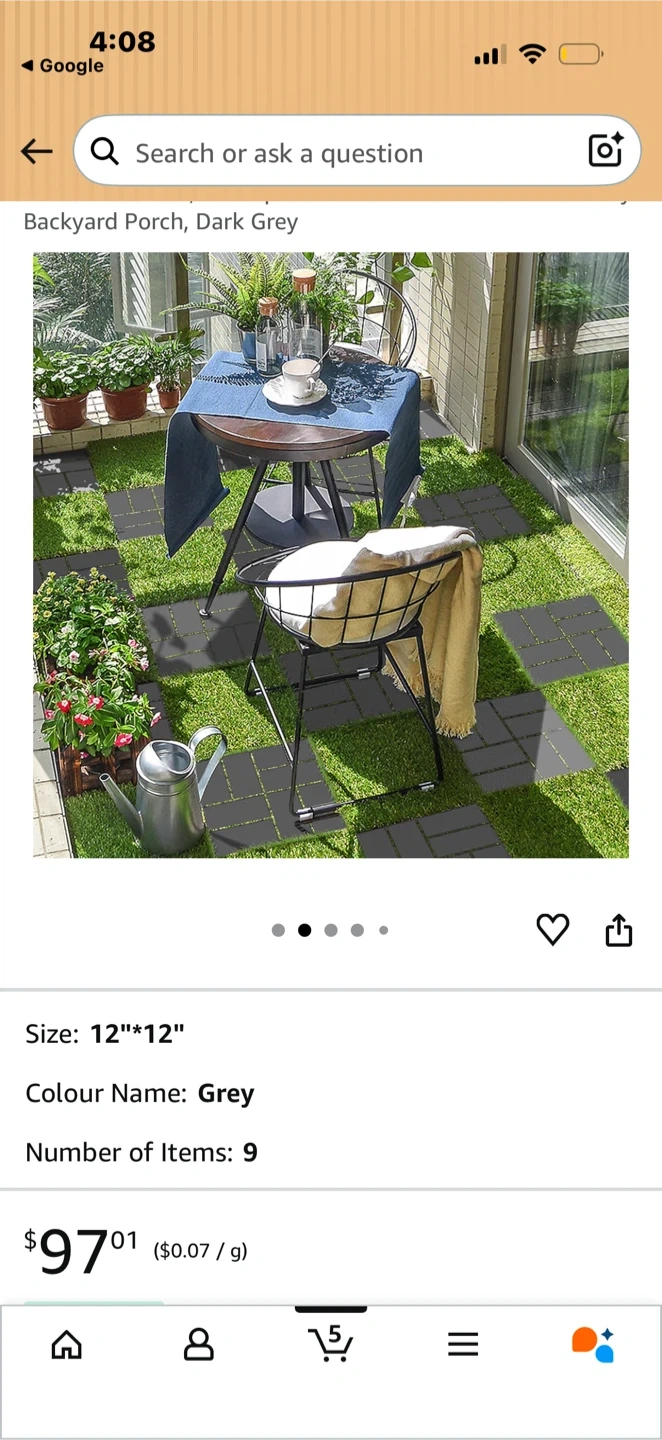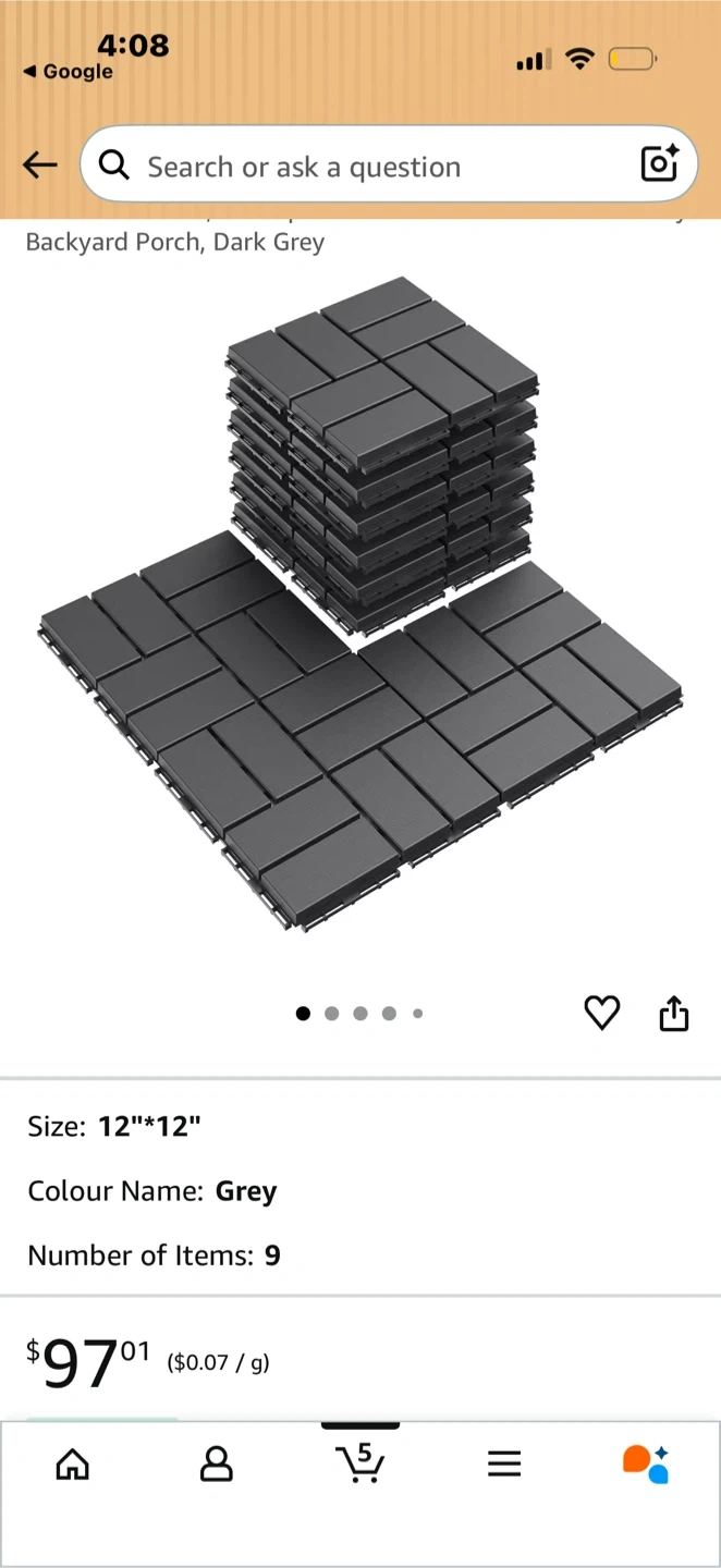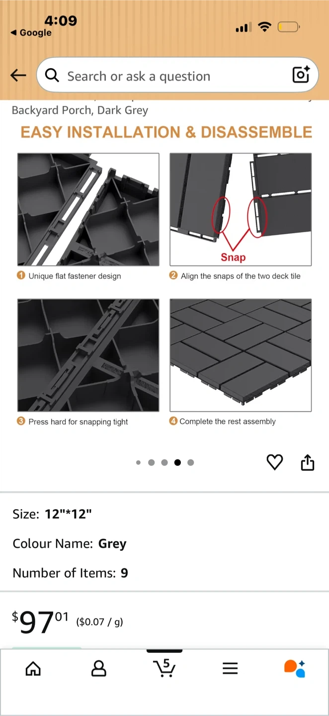 These backyard porch tiles are 12"x12" and come in a dark grey colour. They're made of high-hardness plastic with a stable diamond base and efficient drainage. The tiles offer non-slip and good stability, making them great for outdoor areas.