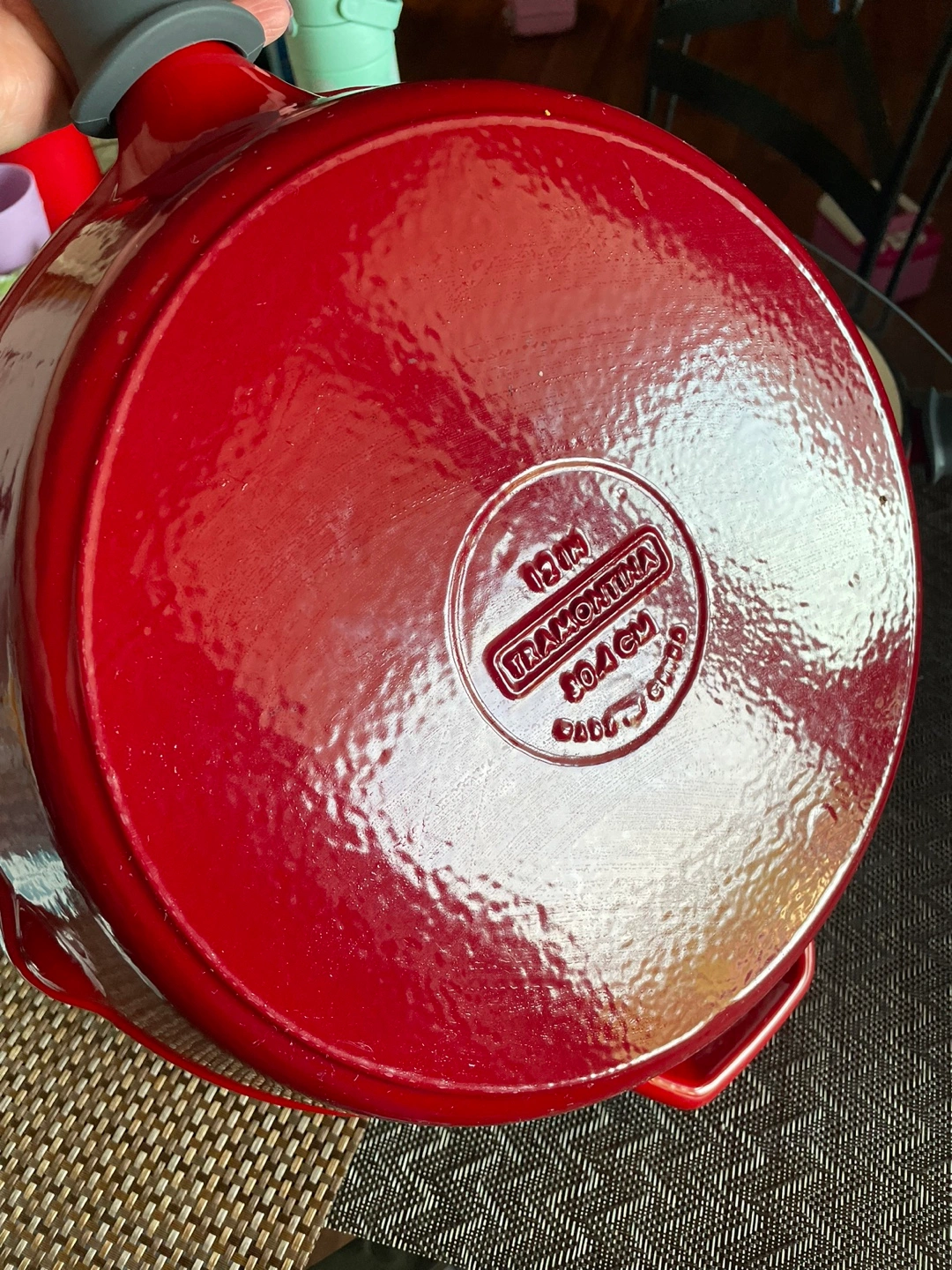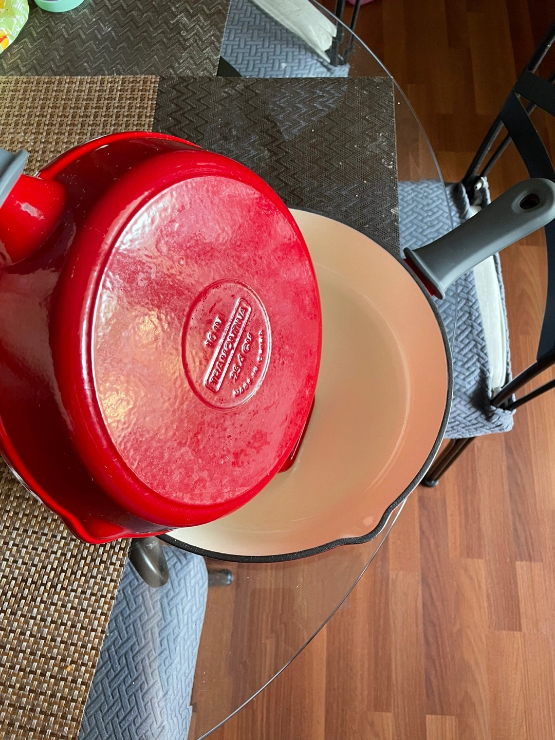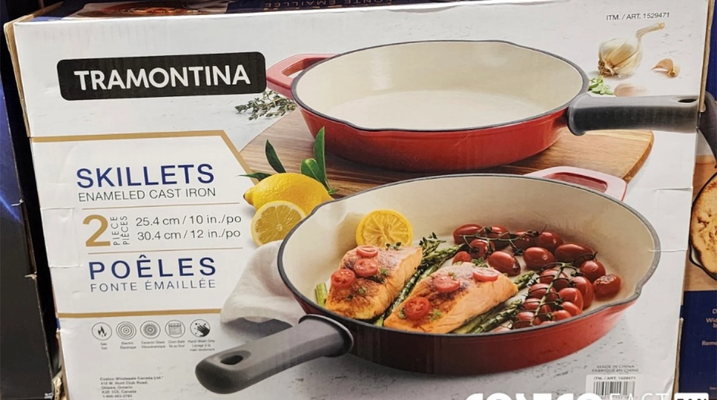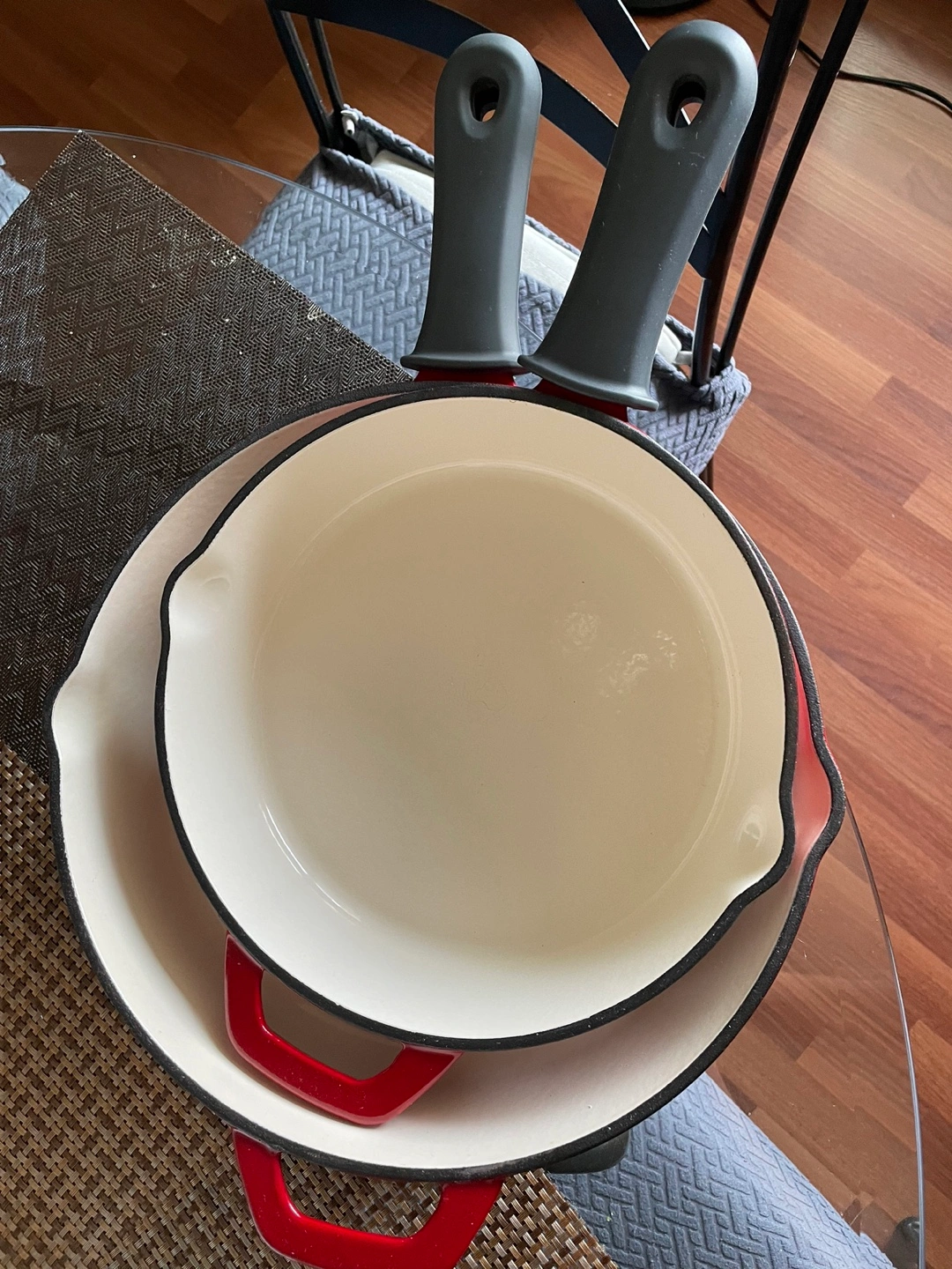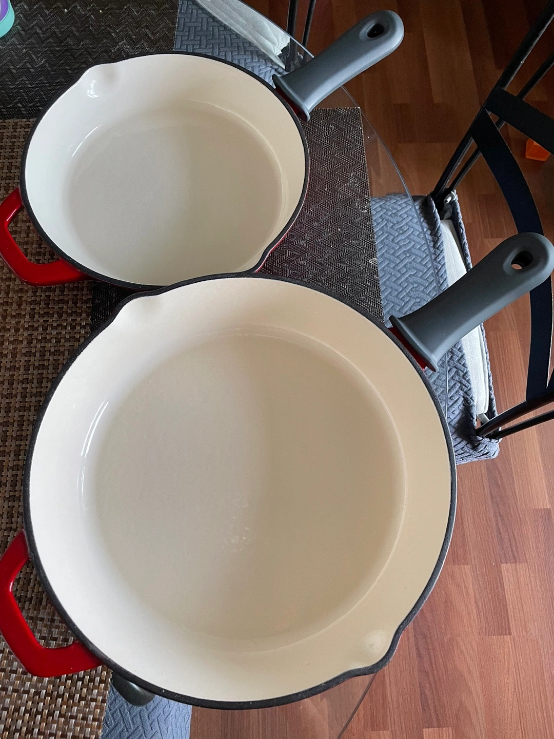 A set of two enameled cast iron skillets. Red exterior and cream-coloured interior. Features two different sizes, one 10 inch and one 12 inch. Bought from Costco. Seldom used Like New. No box