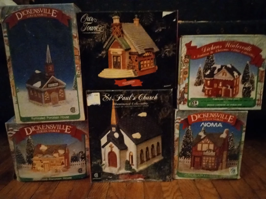 111Selling a Dickensville Collectibles Christmas village set! Includes various buildings and figurines to create a charming holiday display. Comes with original boxes for some of the pieces