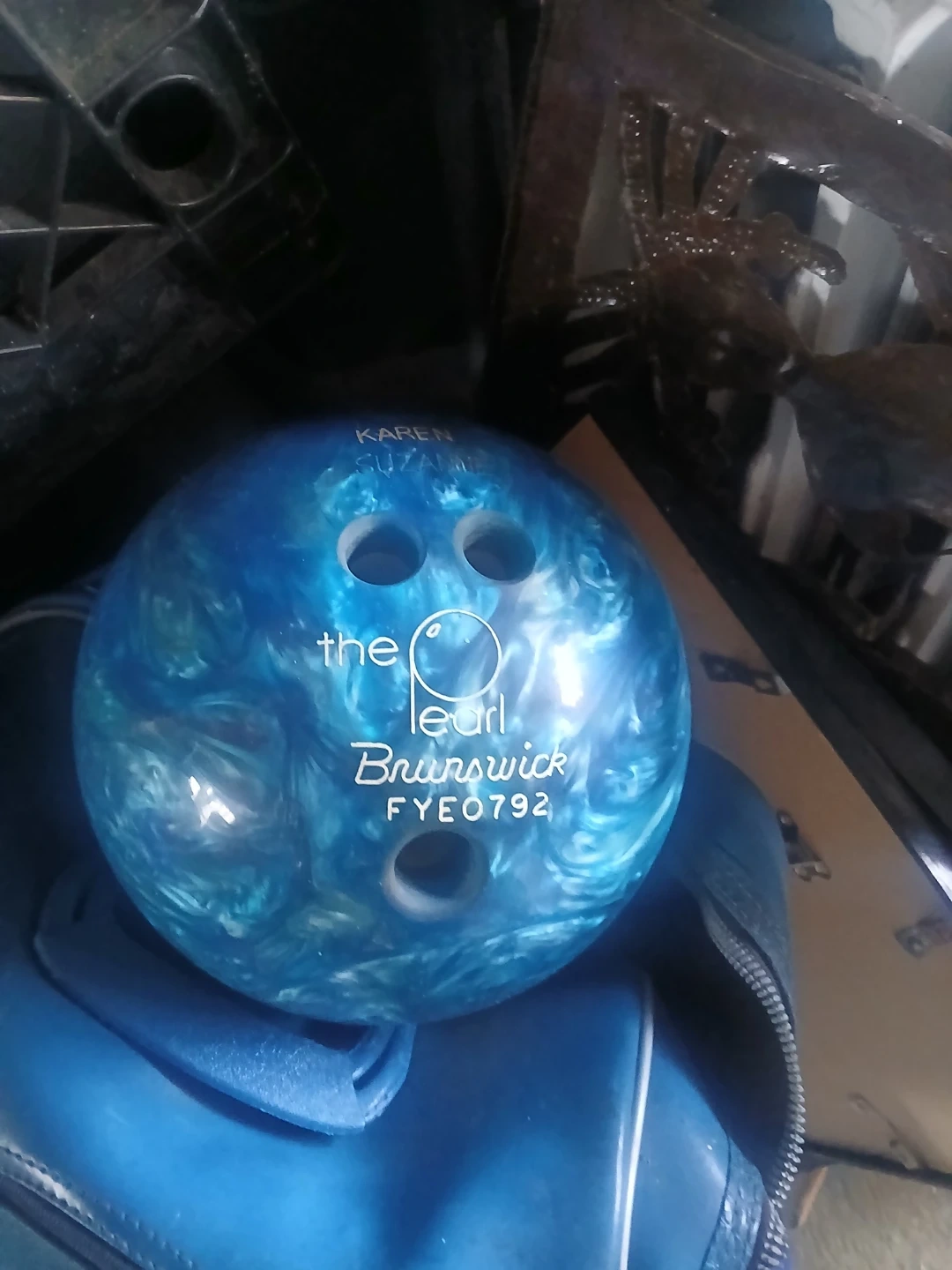 Selling a Brunswick bowling ball along with a blue bowling bag. The ball is a 'The Pearl Brunswick' model. It has some signs of use but is still in good condition for bowling. The bag is blue and has a zipper.🥕