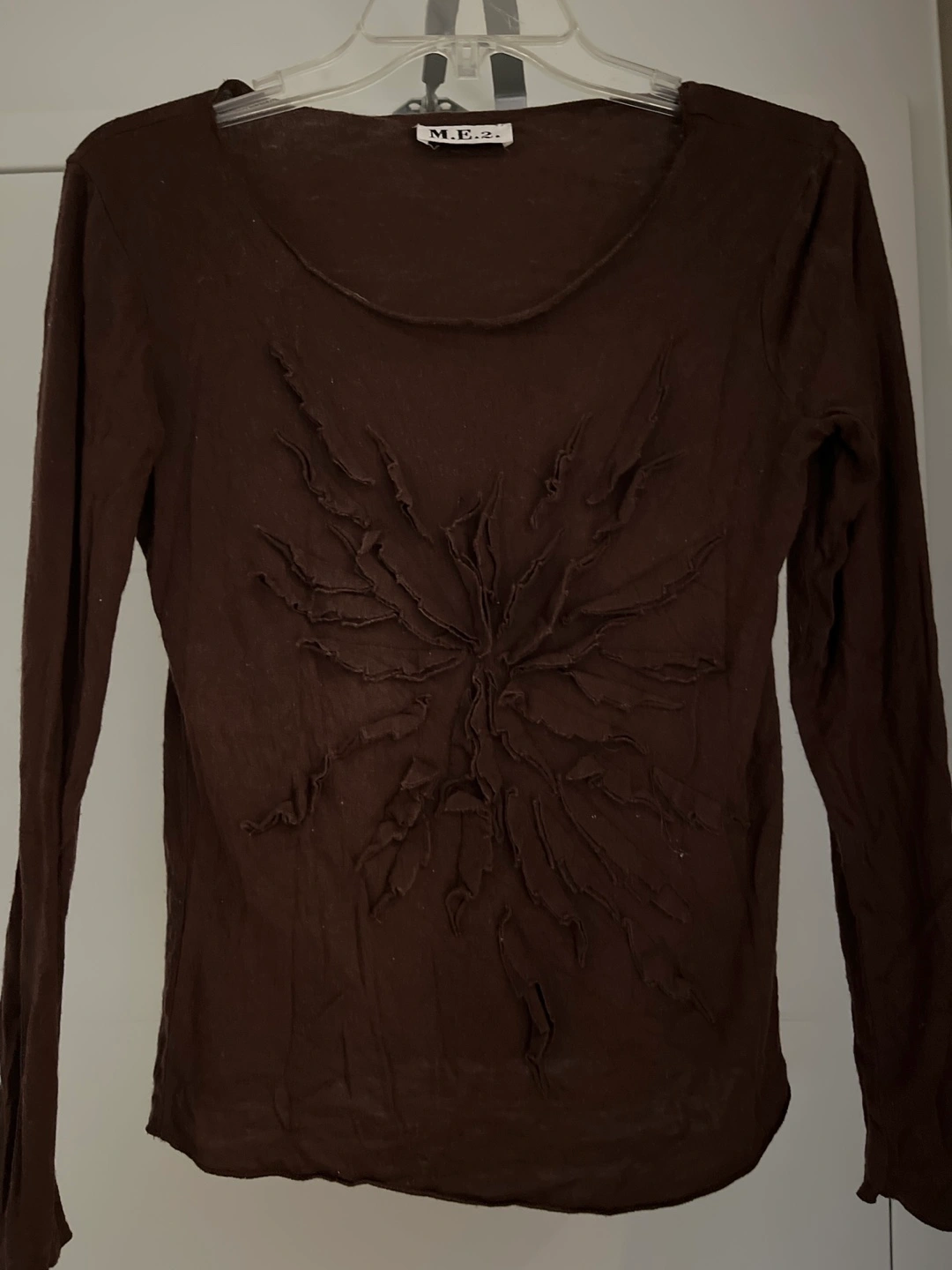 A cute brown long sleeve top from M.E.2! The shirt features a unique design on the front. Great for layering or wearing on its own