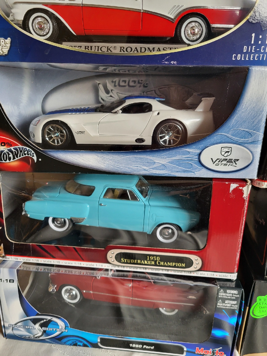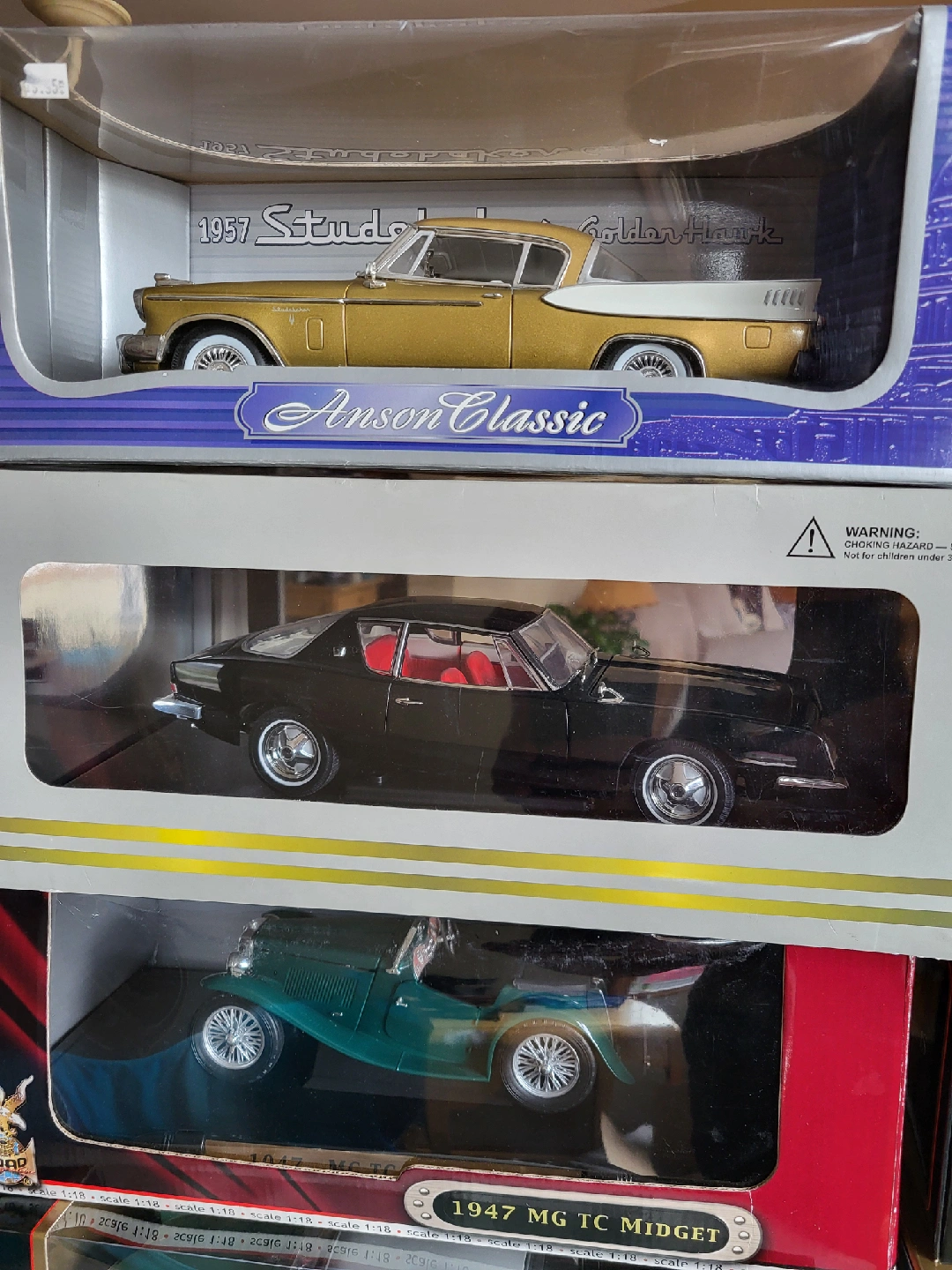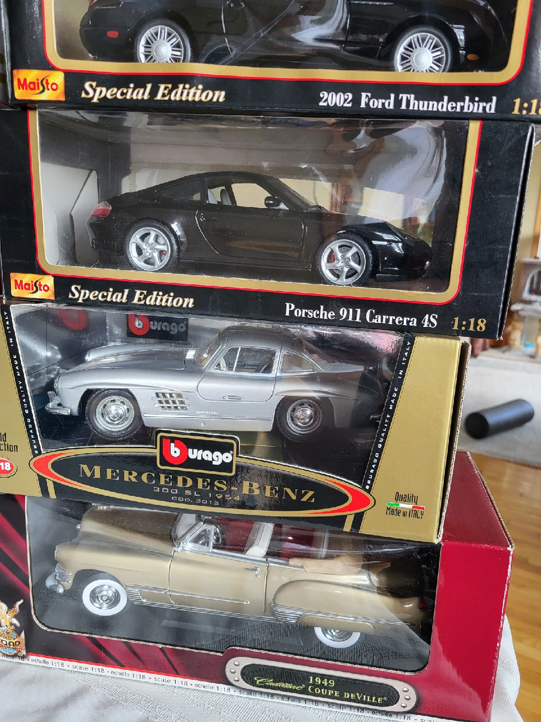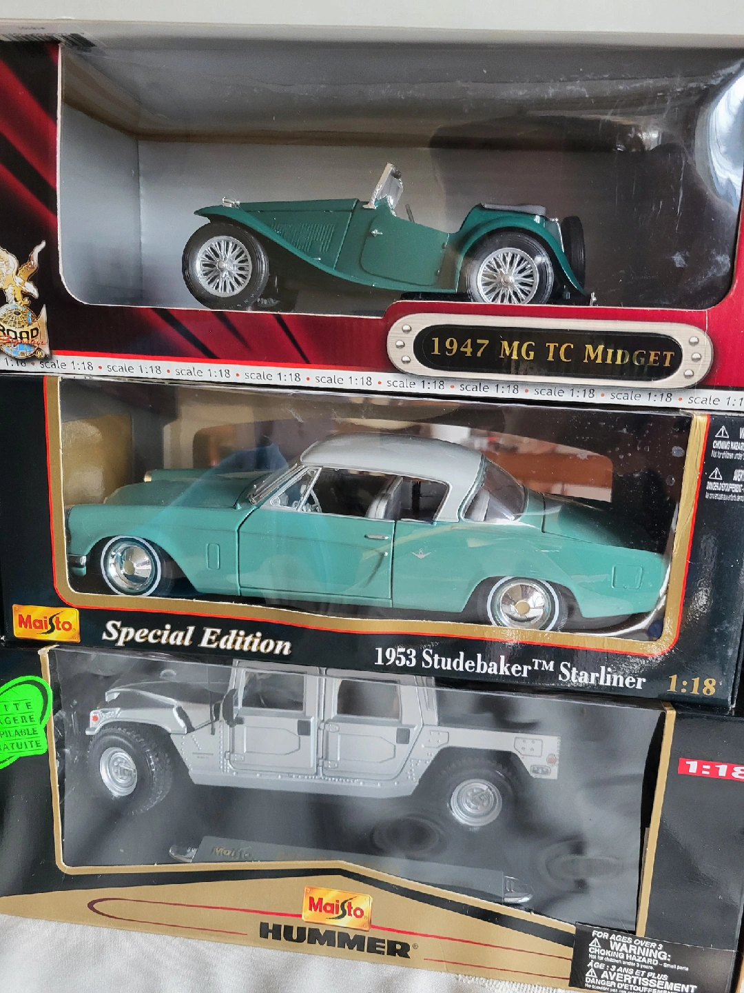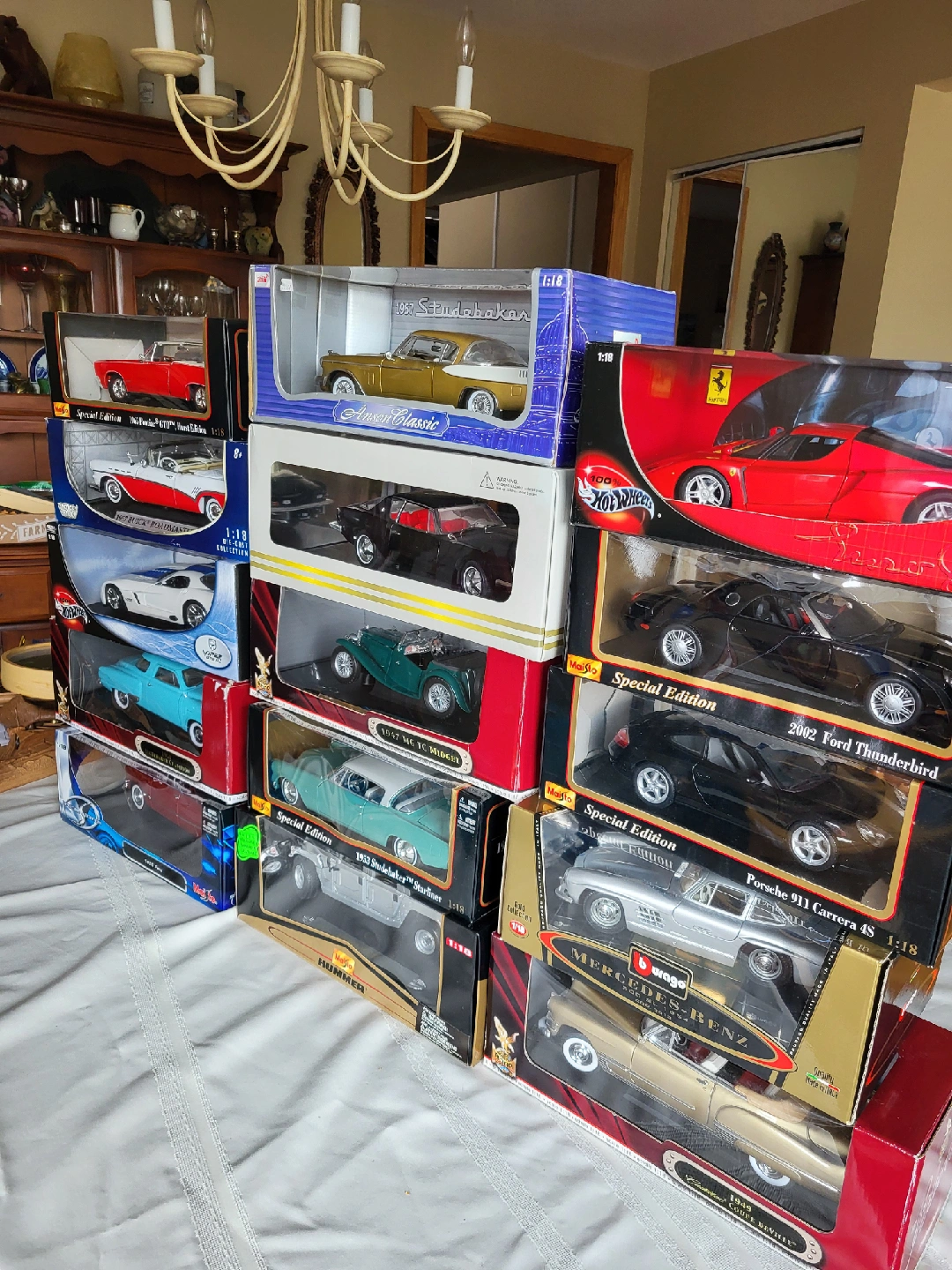 Selling a collection of 1: 18 diecast model cars, including: - 1957 Studebaker Golden Hawk (Anson Classic) - 1947 MG TC Midget - 2002 Ford Thunderbird - Porsche 911 Carrera 4S - Mercedes-Benz 300 SL - 1949 Cadillac Coupe DeVille - 1953 Studebaker Starliner - Hummer & more. All are in their original boxes and appear to be in great condition! $50 each or offers on multiples. St Vital Pickup.