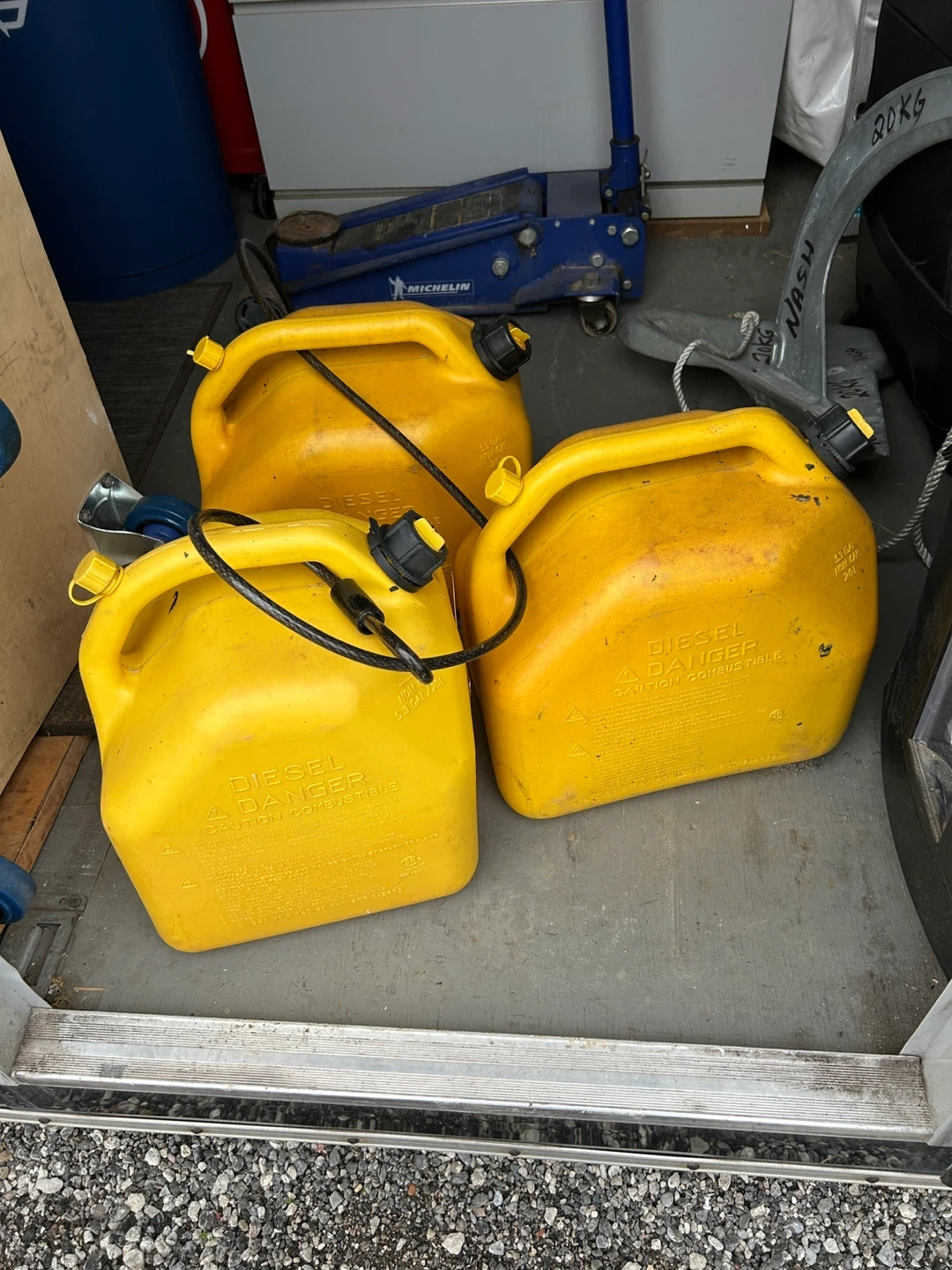 78Selling three yellow diesel fuel cans. Each can holds approximately 5.3 gallons or 20 litres. They are marked with 'Diesel A Danger Caution Combustible'.