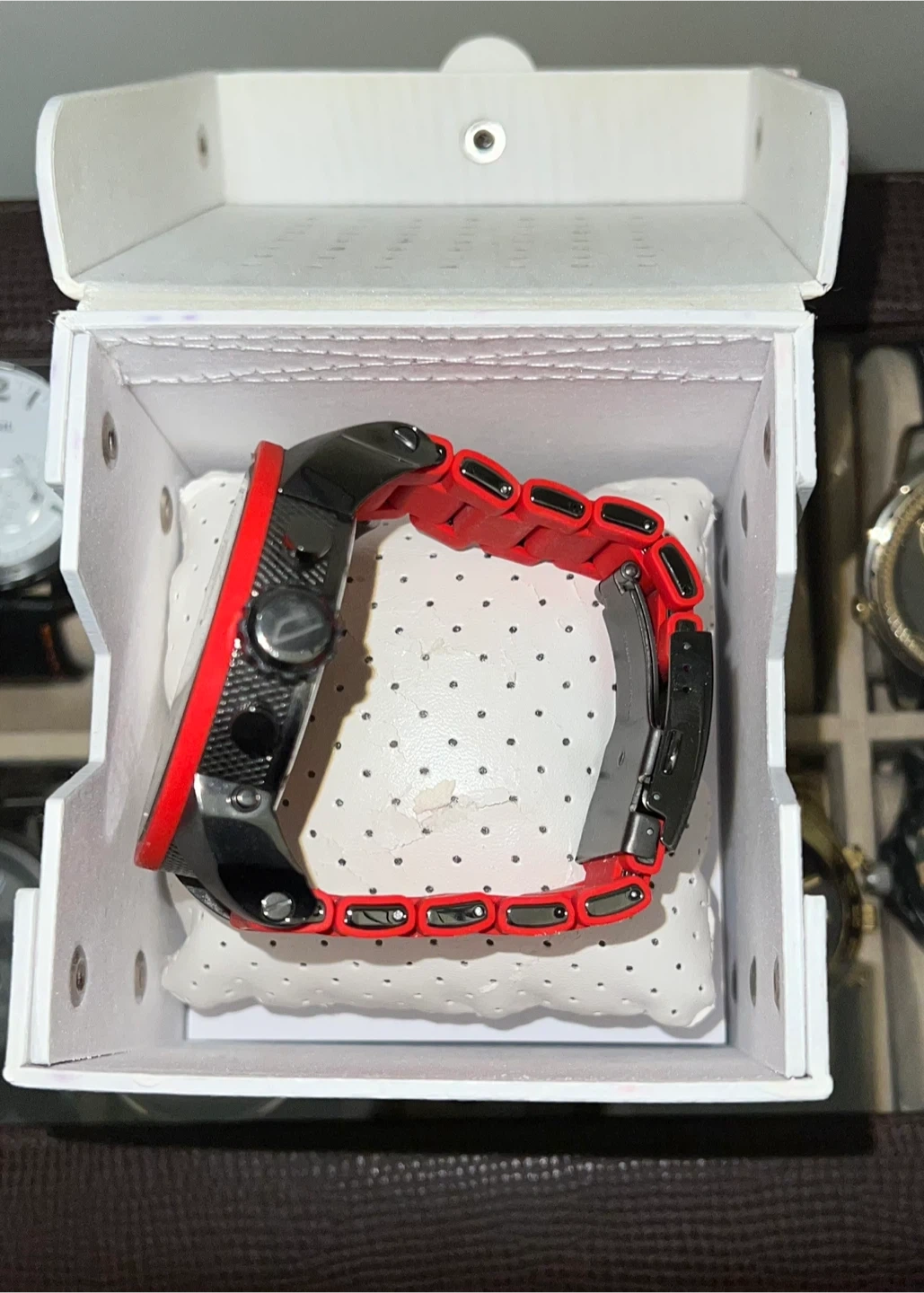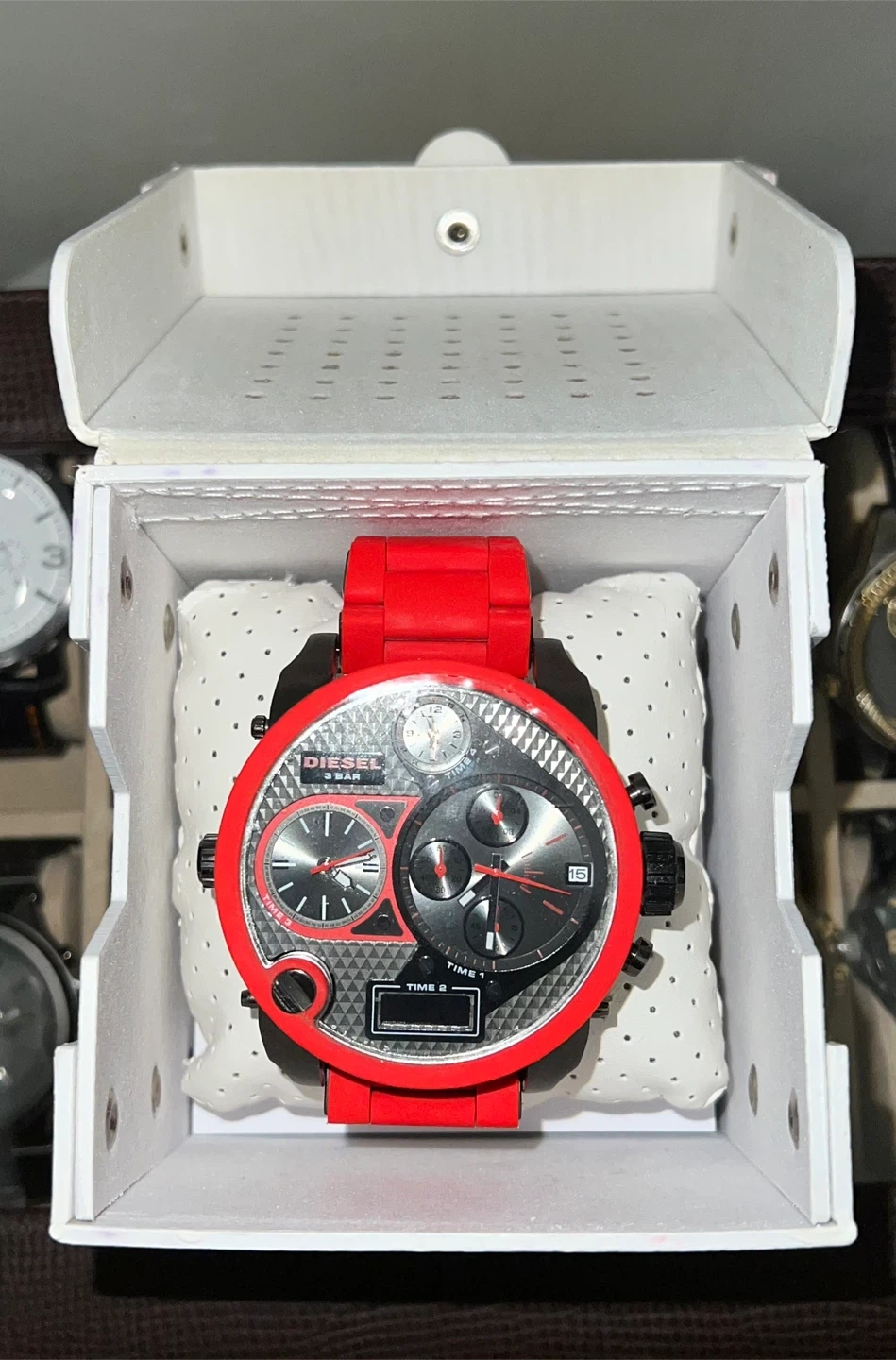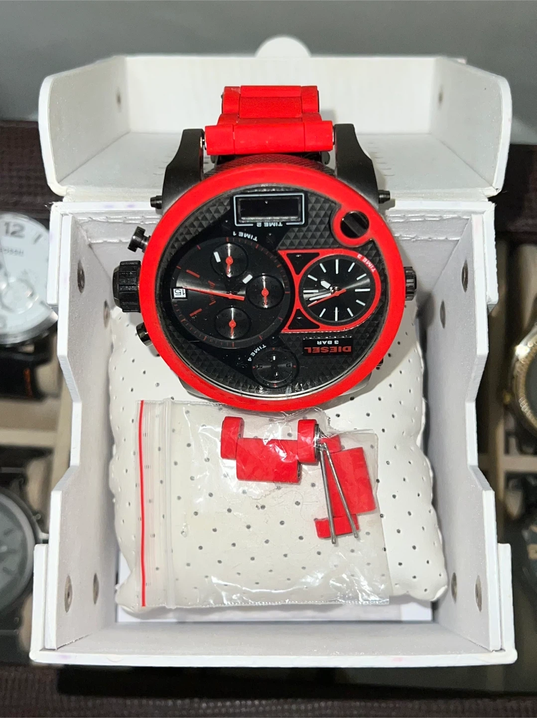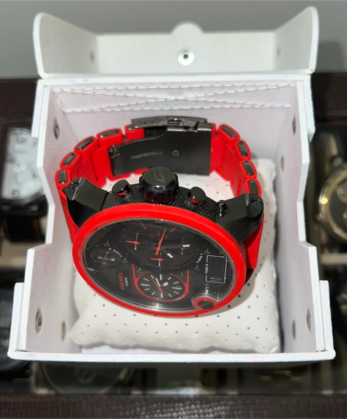 15Selling a Diesel Mr. Daddy 2.0 watch in red and black! It comes with its original box and the extra pieces shown in the photos. This stylish watch is sure to make a statement! I've got a watch that's still in its box, worn only once, and I'm looking to sell it for $450 a steal considering I paid over $700 for it initially.
