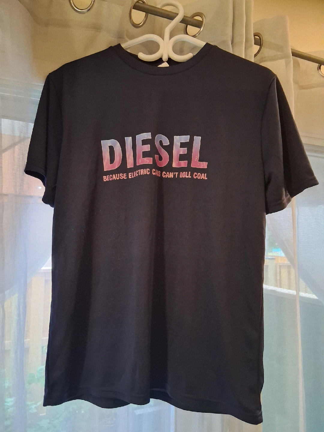 5Diesel T-shirt with the text 'DIESEL because electric cars can't roll coal' printed on the front