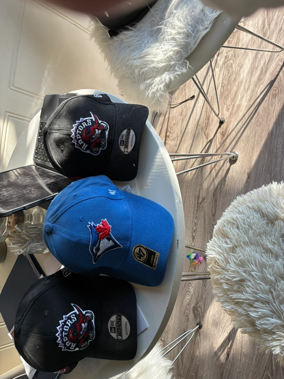 Two New Era Toronto Raptors hats and one 47 Brand Toronto Blue Jays hat. All hats are adjustable. $20.00