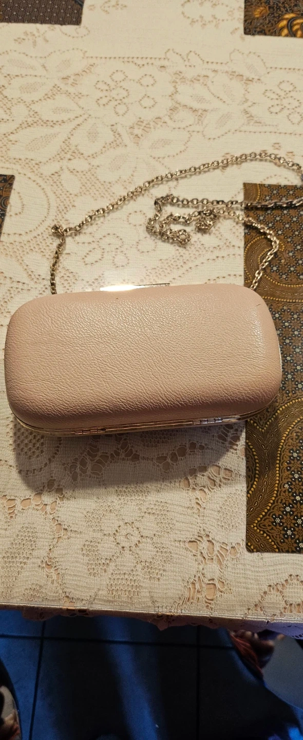 This is an ALDO clutch purse in a pale pink colour. It comes with a detachable silver chain strap. Interior is lined with black fabric and a mirrored on the side.