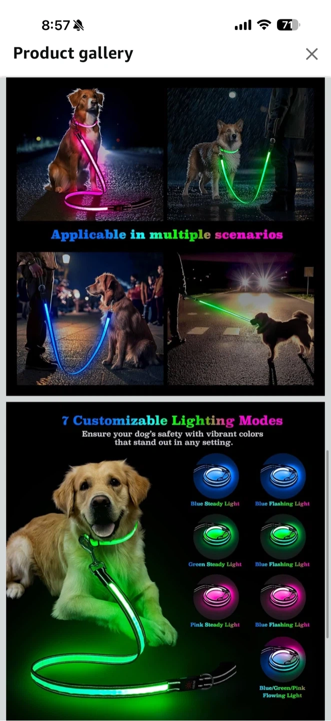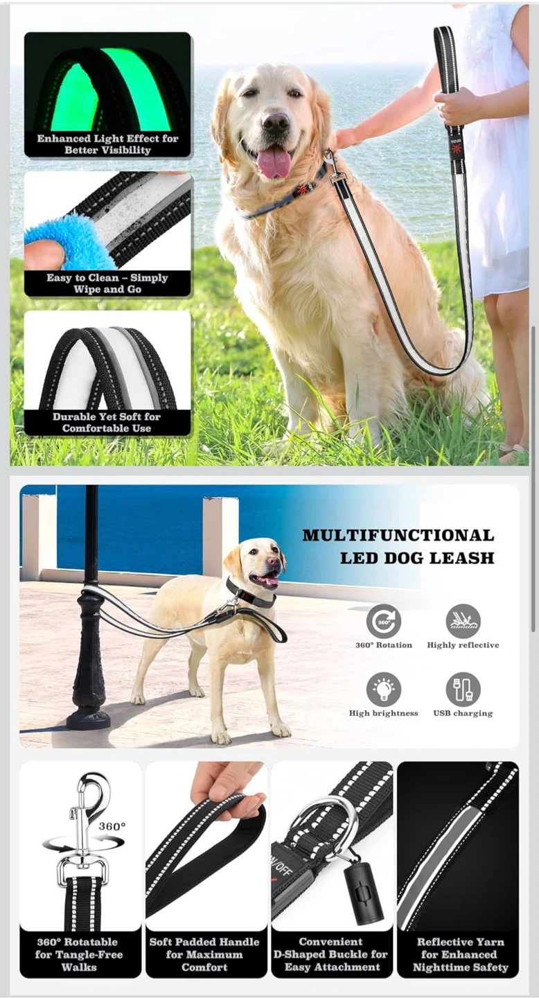 This multifunctional LED dog leash features 7 customizable lighting modes for enhanced visibility and safety. It's USB rechargeable, has a padded handle for comfort, and a 360-degree rotatable D-shaped buckle for tangle-free walks. Reflective yarn is woven in for added nighttime safety.🏆