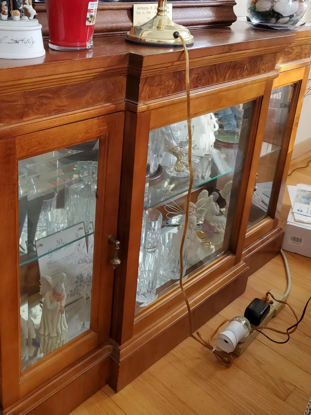 This is a beautiful wooden display cabinet with glass doors. It features adjustable glass shelves perfect for showcasing your favorite items. The rich wood finish adds a touch of elegance to any room. Ideal for collectors or as a decorative piece in your home!