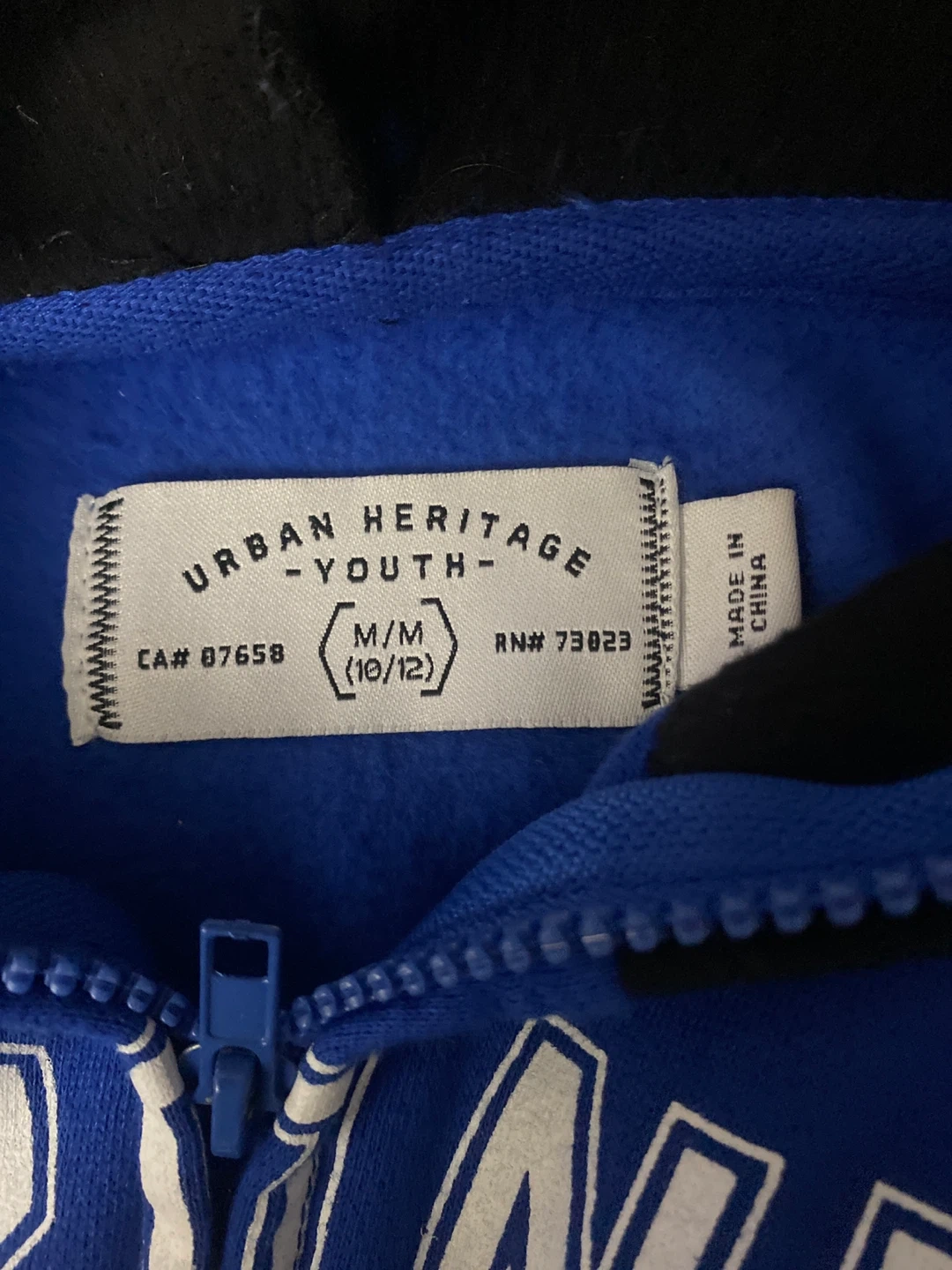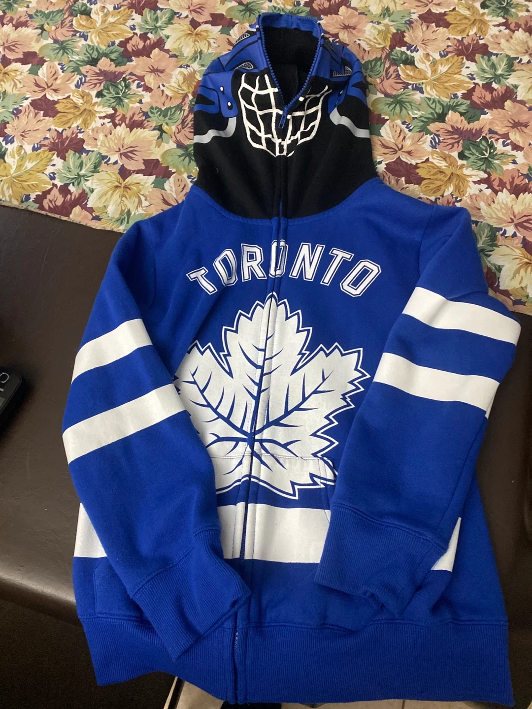 This Urban Heritage youth hoodie features a bold Toronto Maple Leafs design. It's a full-zip style with a comfortable hooded neckline. The size is M/M, which corresponds to a youth size 10/12.