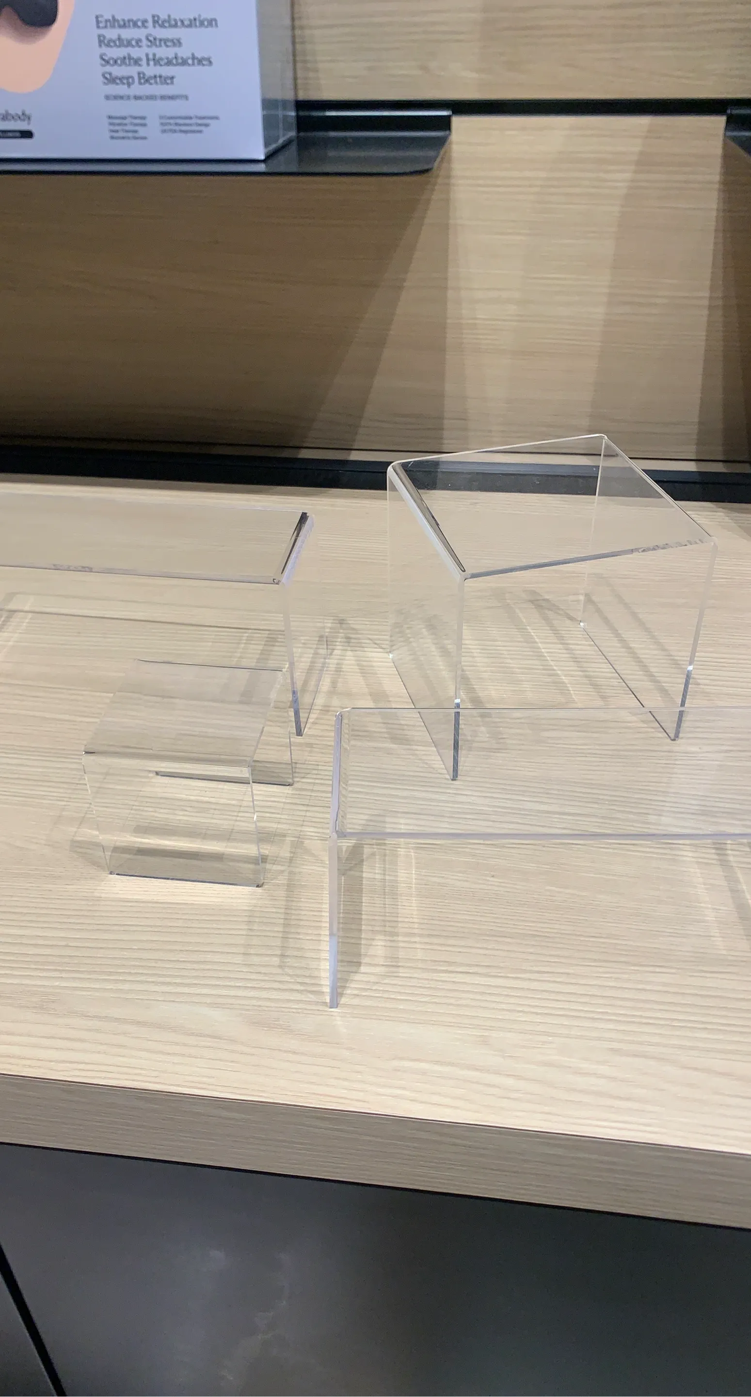 This set includes 9 clear acrylic risers for displaying items. They're made of durable acrylic material and come in various heights. Perfect for showcasing small products or collectibles!