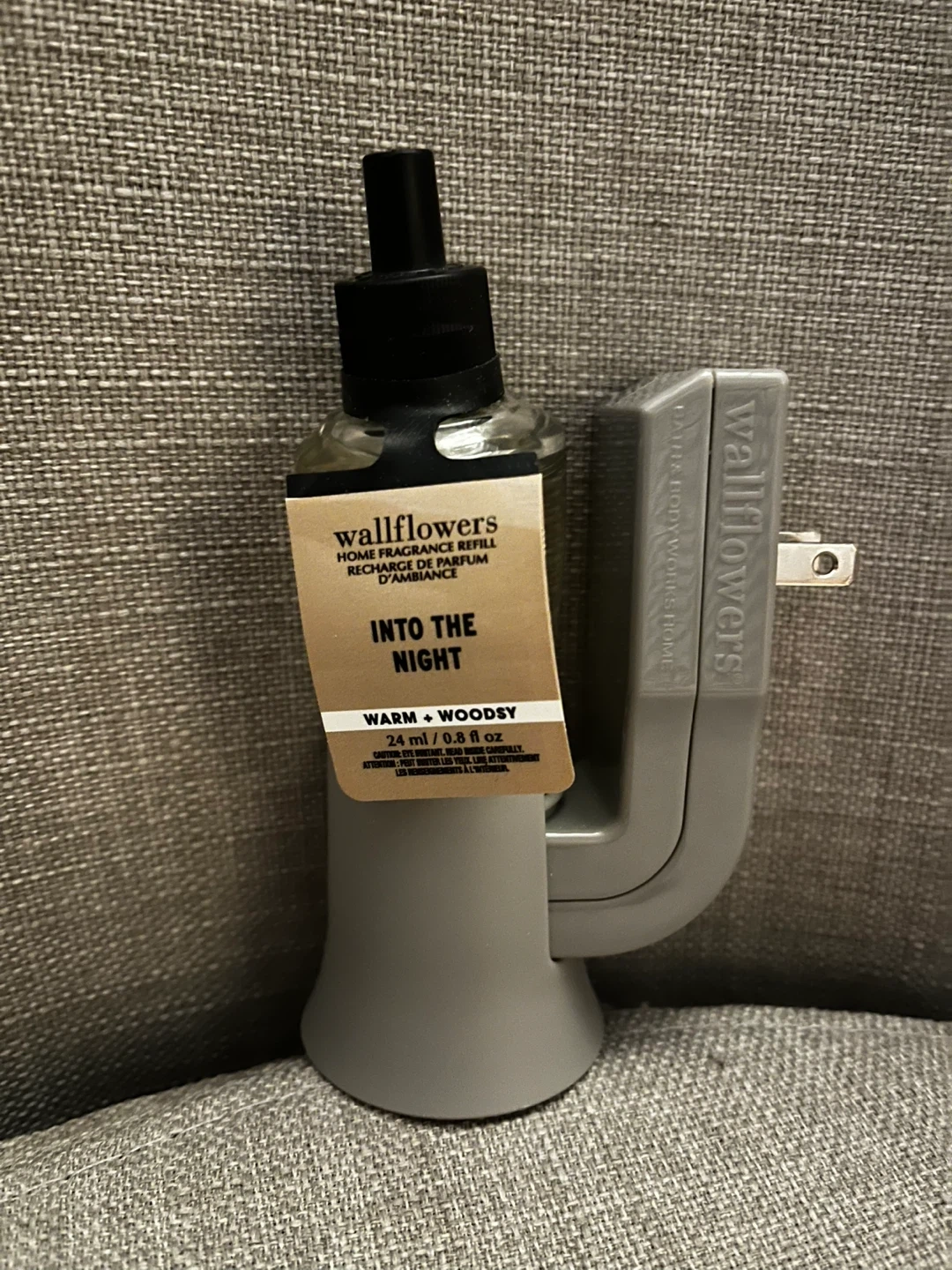 This is a Bath & Body Works Wallflowers fragrance refill in the scent 'Into the Night'. It's a warm, woodsy scent. The refill is 24 ml / 0.8 fl oz.