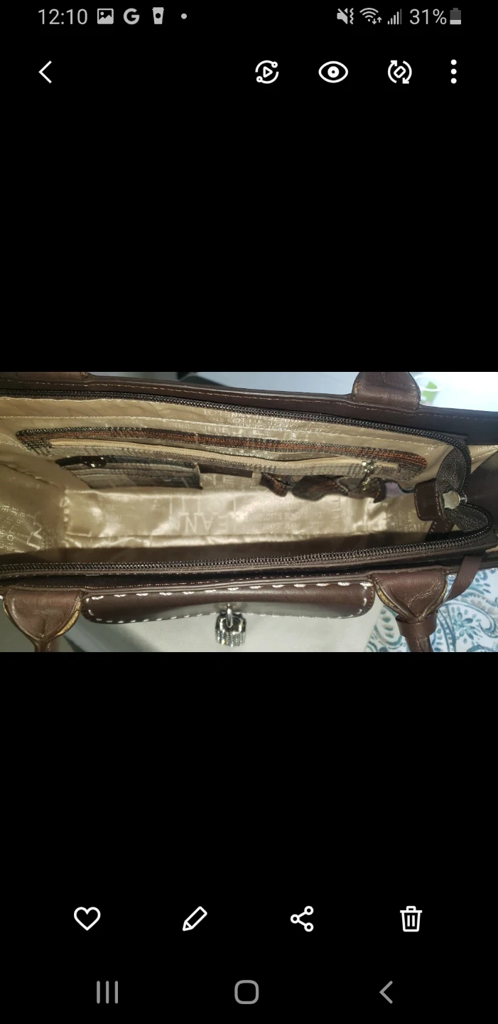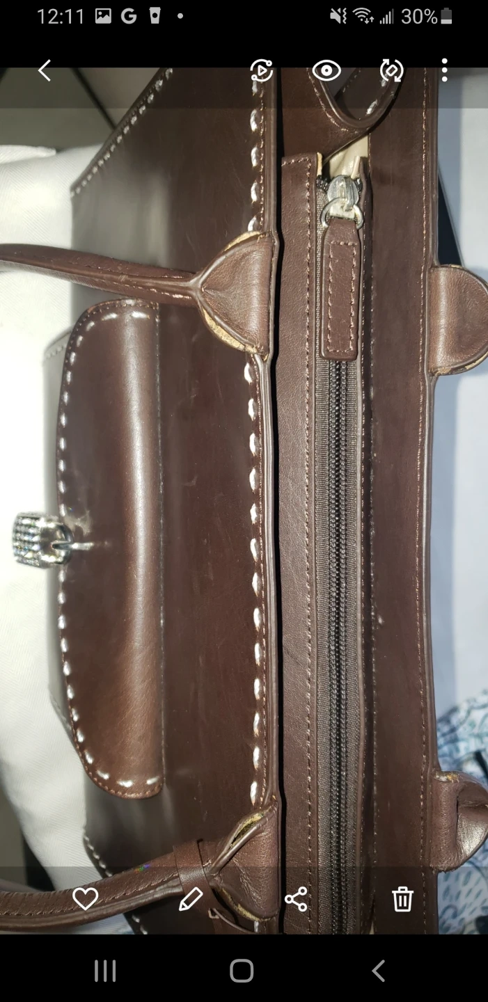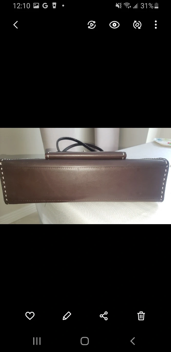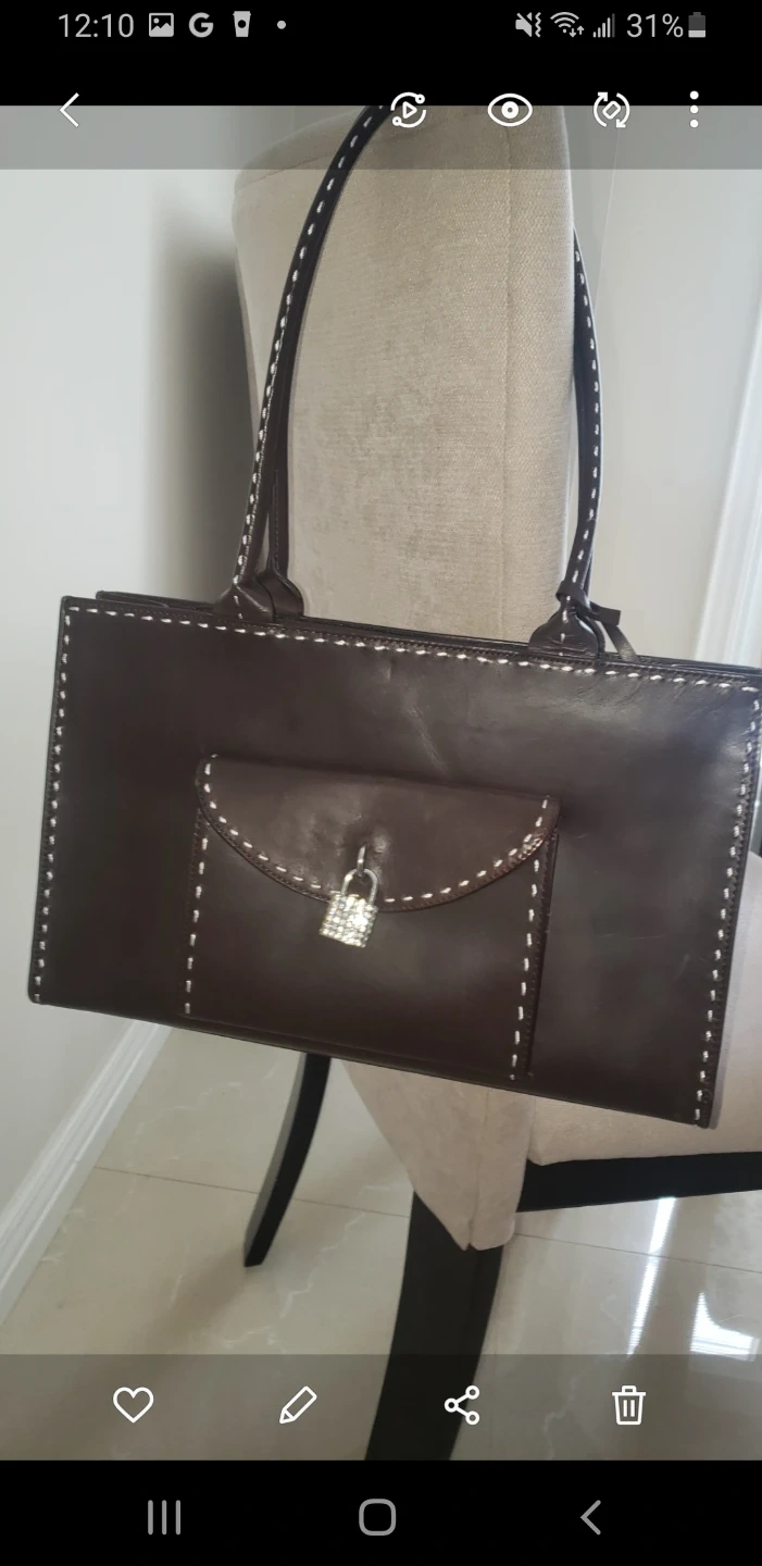 A stylish brown leather tote bag. It's made from genuine leather and features contrast stitching. Includes a secure front pocket with a decorative lock closure.