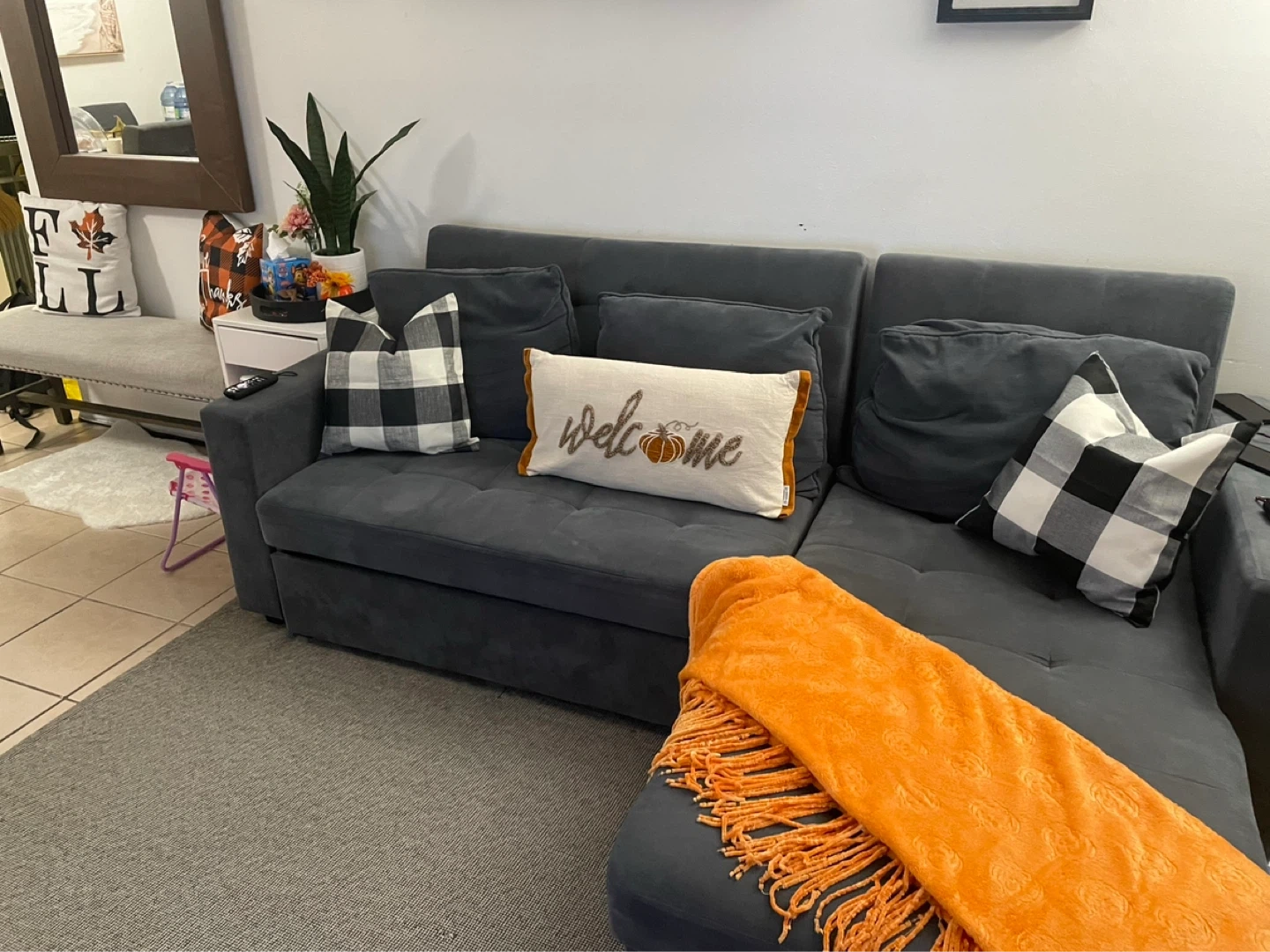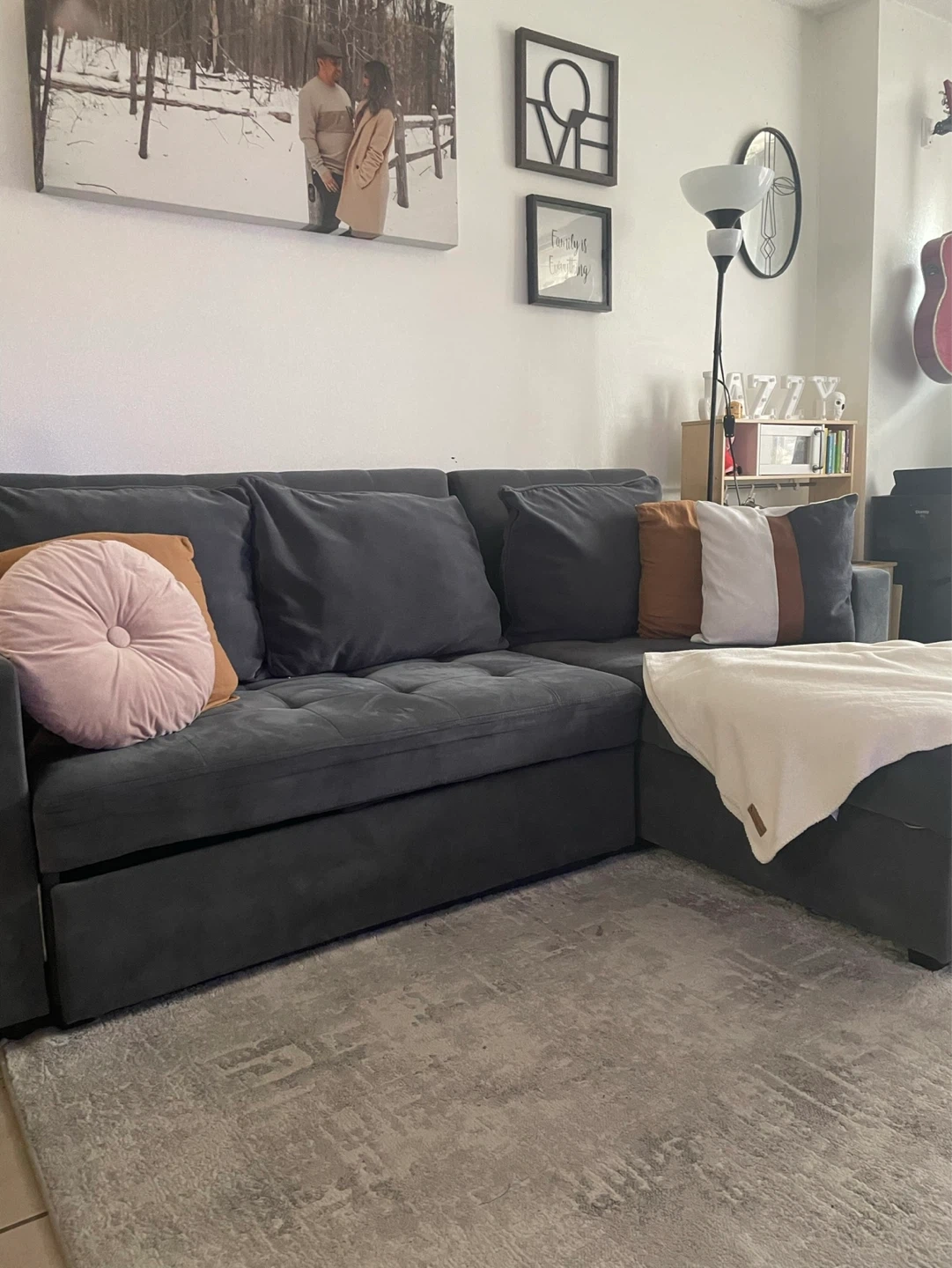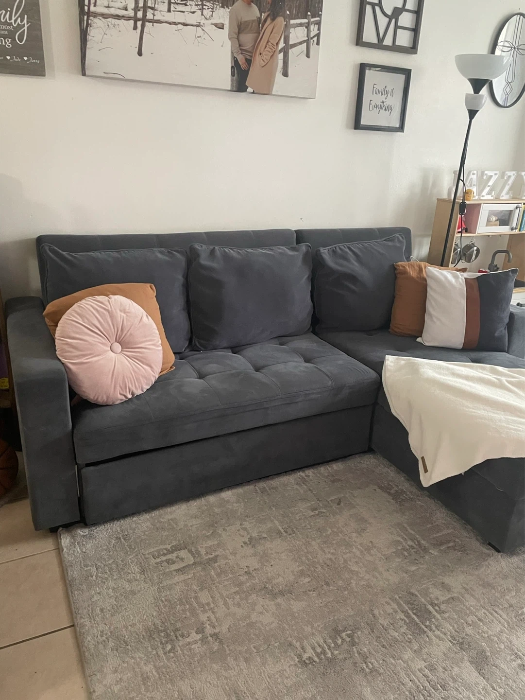 A comfortable dark grey reversible sectional sofabed. can be use left and right facing and can be coverted up to king size. It has tufted seat cushions (throw pillows not included). spring broken under that needs to be pop in, hence the price, but doesn’t really change the function. it also have a storage