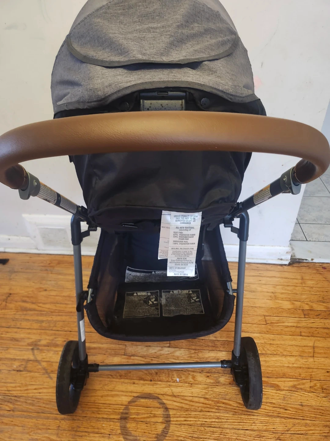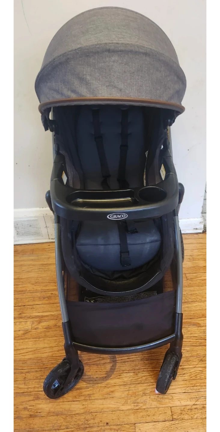 This Graco stroller features a removable tray with a cup holder. It has a five-point harness for safety. The stroller is grey with a brown faux leather handle.