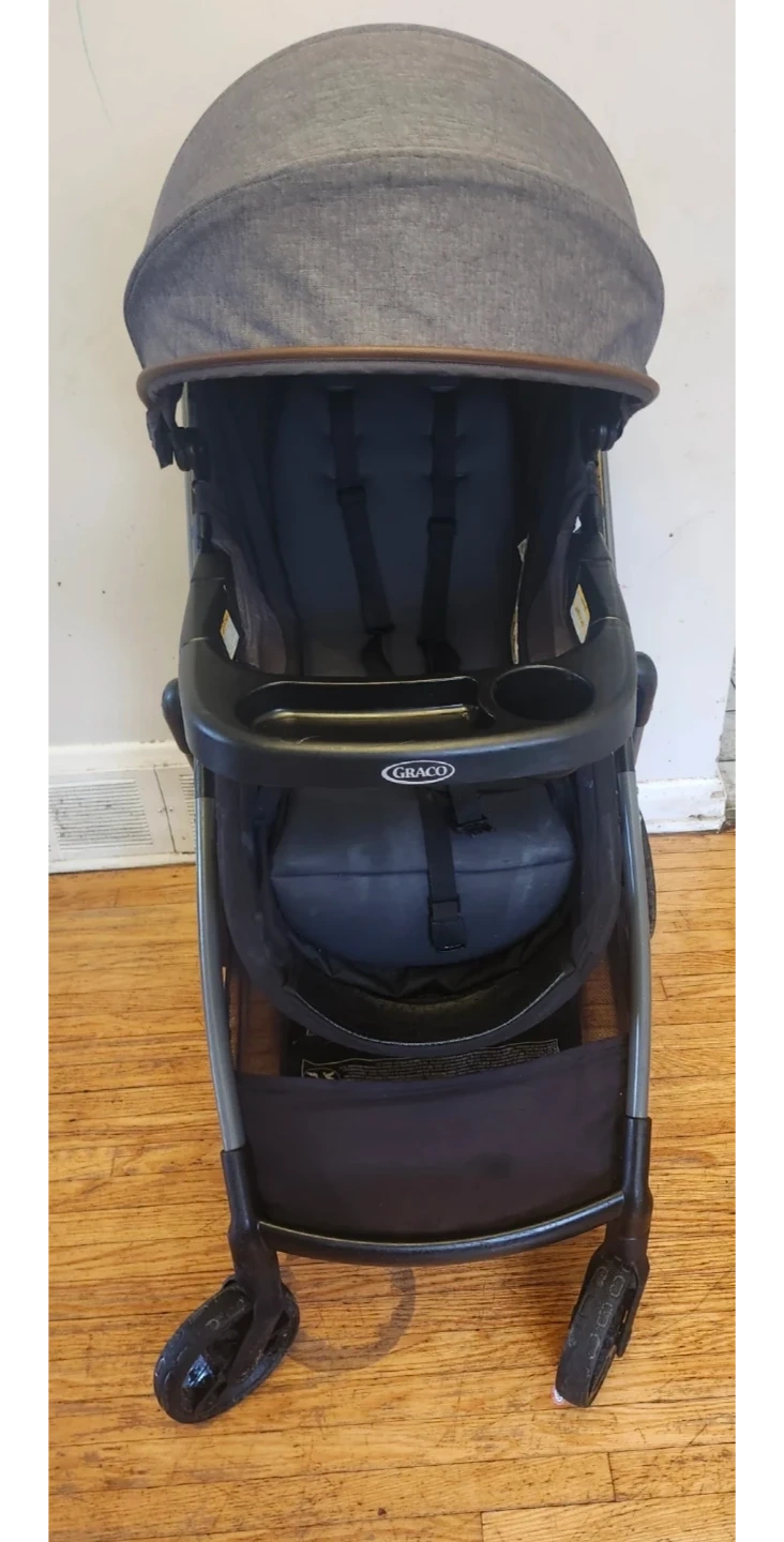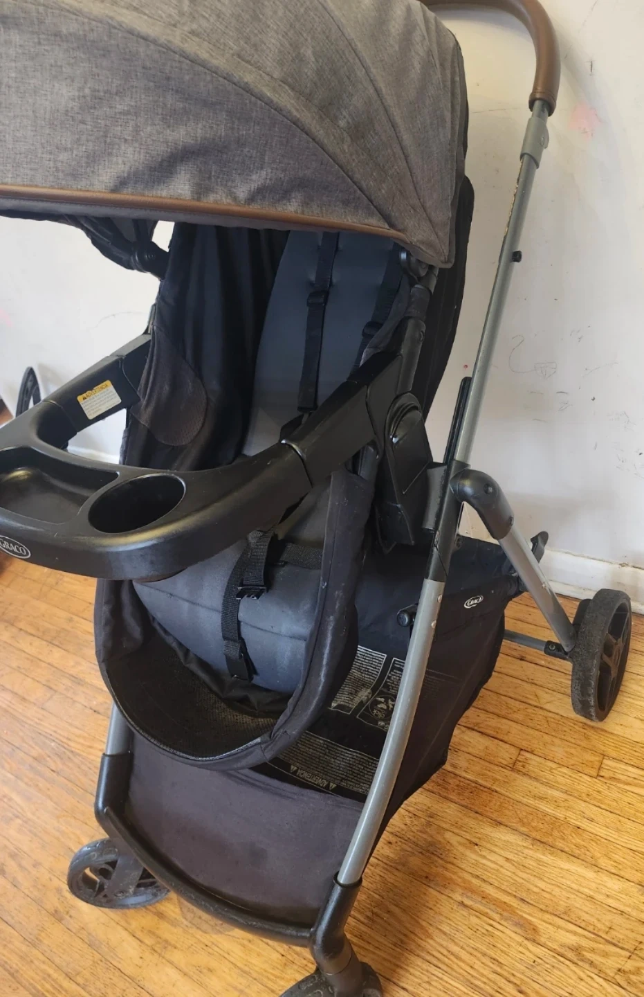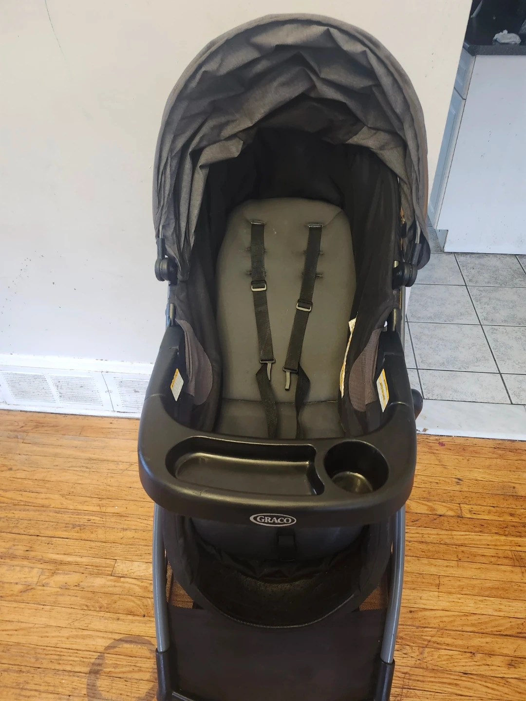 This Graco stroller features a removable tray with a cup holder. It has a five-point harness for safety. The stroller is grey with a brown faux leather handle.