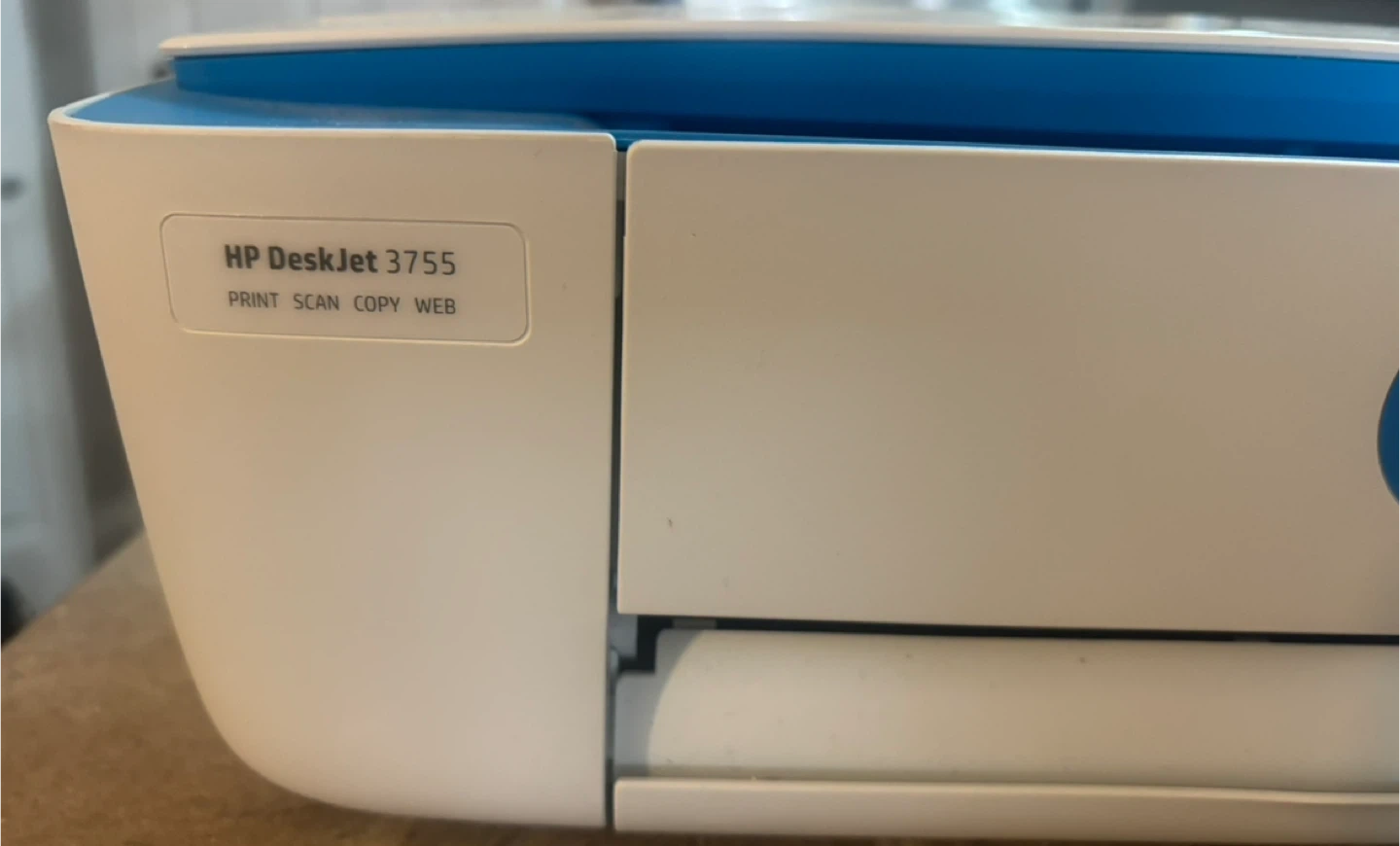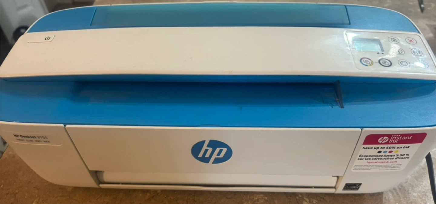HP DeskJet 3755 all-in-one printer. It's white and blue, and prints, scans, and copies. Instant Ink compatible. Pick up in Terwillegar