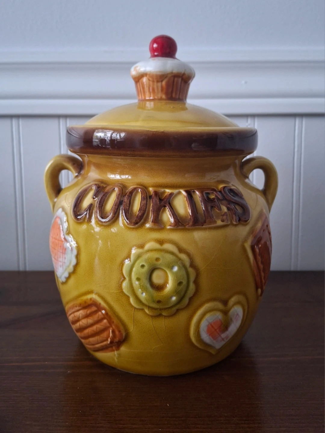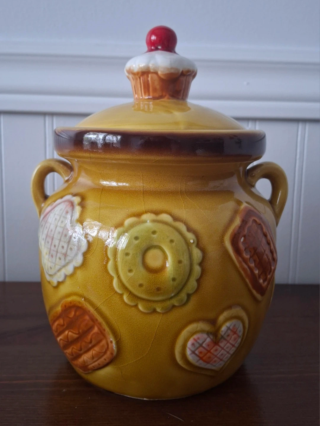 Selling a vintage cookie jar with a lid. It's a charming piece with cookie-shaped designs and a warm, inviting colour. Perfect for adding a touch of nostalgia to your kitchen!