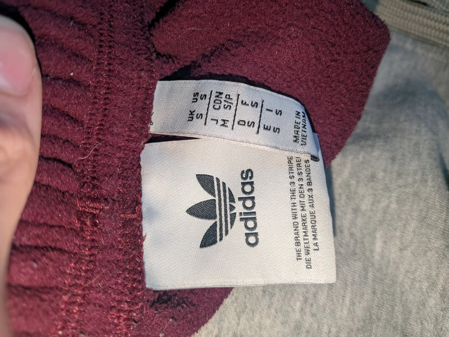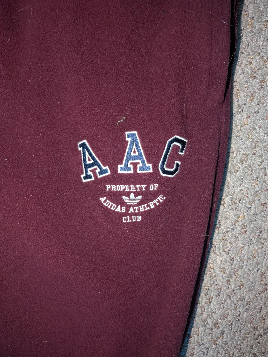 Maroon Adidas Athletic Club sweatpants. These comfy fleece pants have a drawstring waist and the AAC logo on the left leg. Made in Vietnam. Size small.
