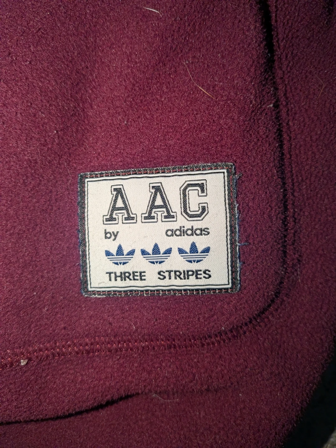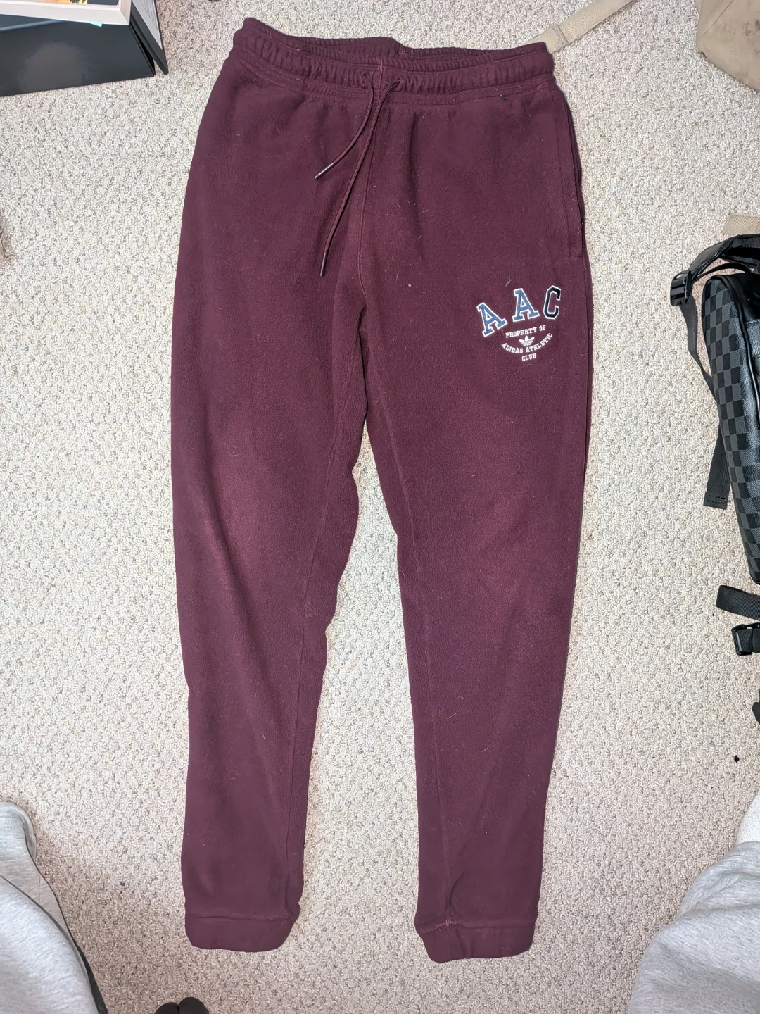 Maroon Adidas Athletic Club sweatpants. These comfy fleece pants have a drawstring waist and the AAC logo on the left leg. Made in Vietnam. Size small.