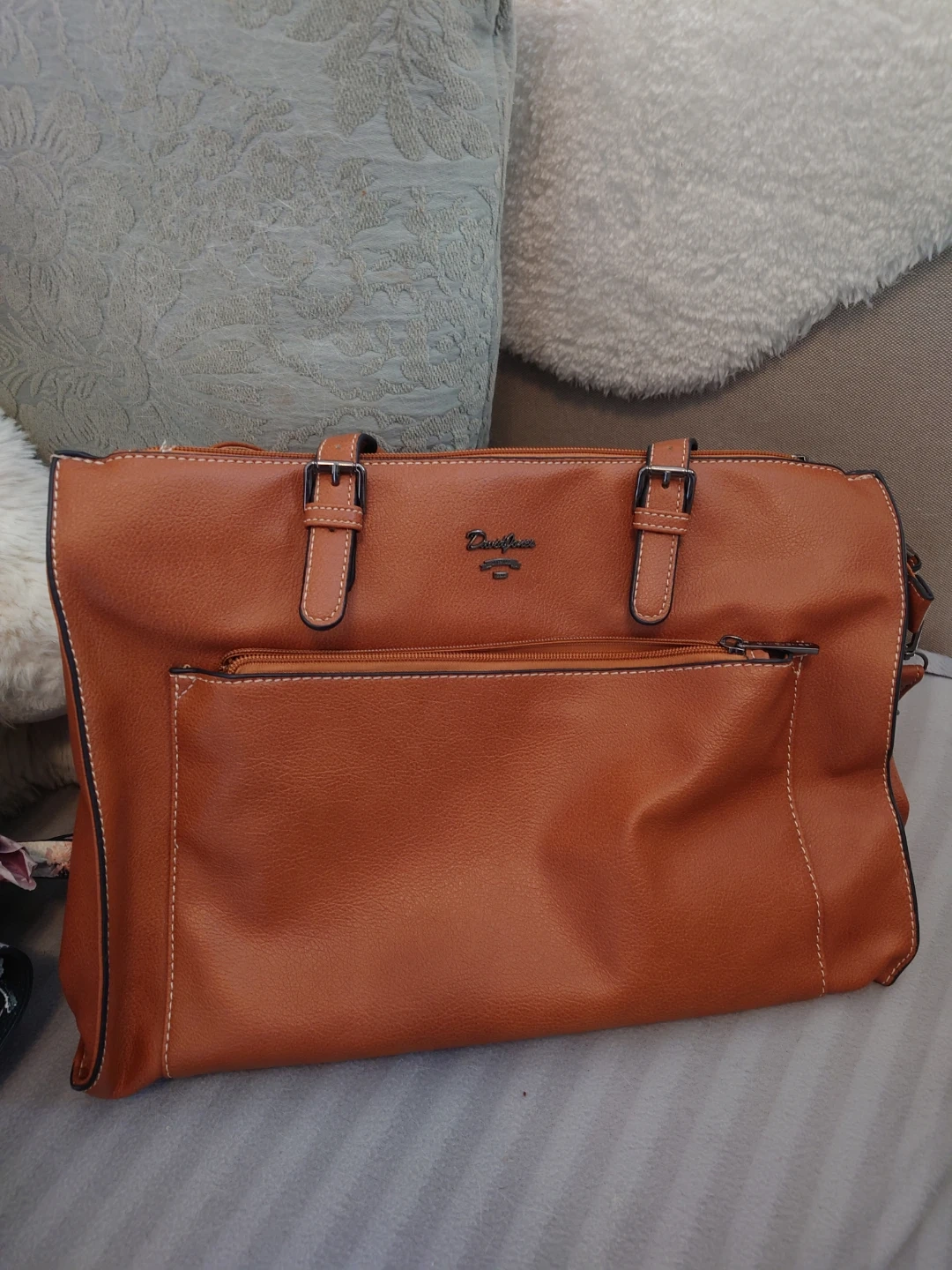 Stylish tan tote bag with a faux leather finish. It features a front zippered pocket and multiple compartments inside for organization. This bag is perfect for everyday use and laptops.
