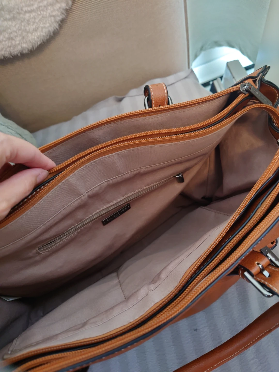 Stylish tan tote bag with a faux leather finish. It features a front zippered pocket and multiple compartments inside for organization. This bag is perfect for everyday use and laptops.