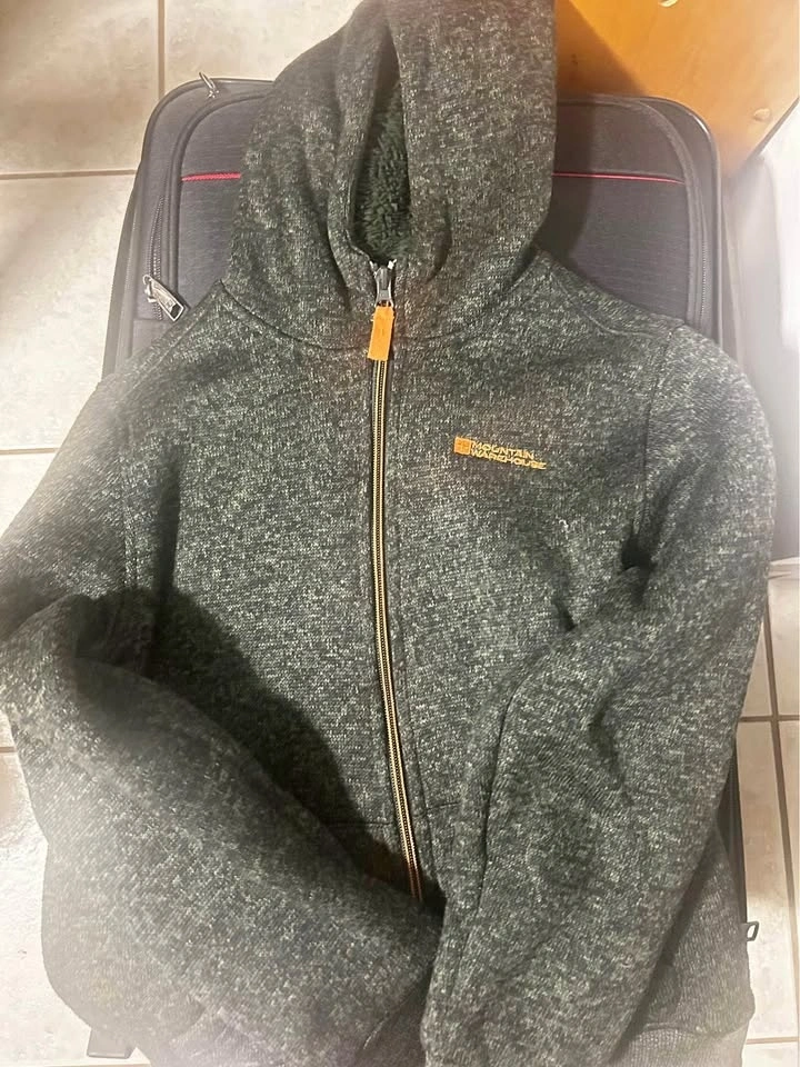 Cozy Mountain Warehouse kids hooded fleece jacket. Dark green/grey marl color with a bright orange zipper. It has a super soft fleece lining in the hood. Size 11-12 years.Pick up in New Westminster.