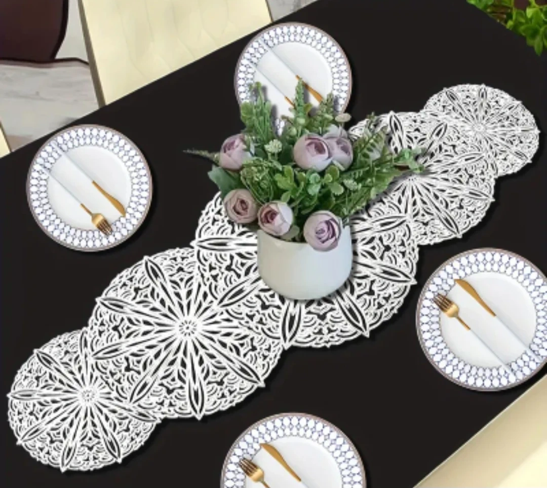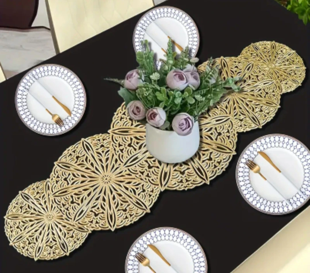Beautiful gold table runner with a lace-like cutout design. Adds a touch of elegance to any dining table. Measures 13.4 inches wide by 35.5 inches long. Perfect for special occasions or everyday decorative use!