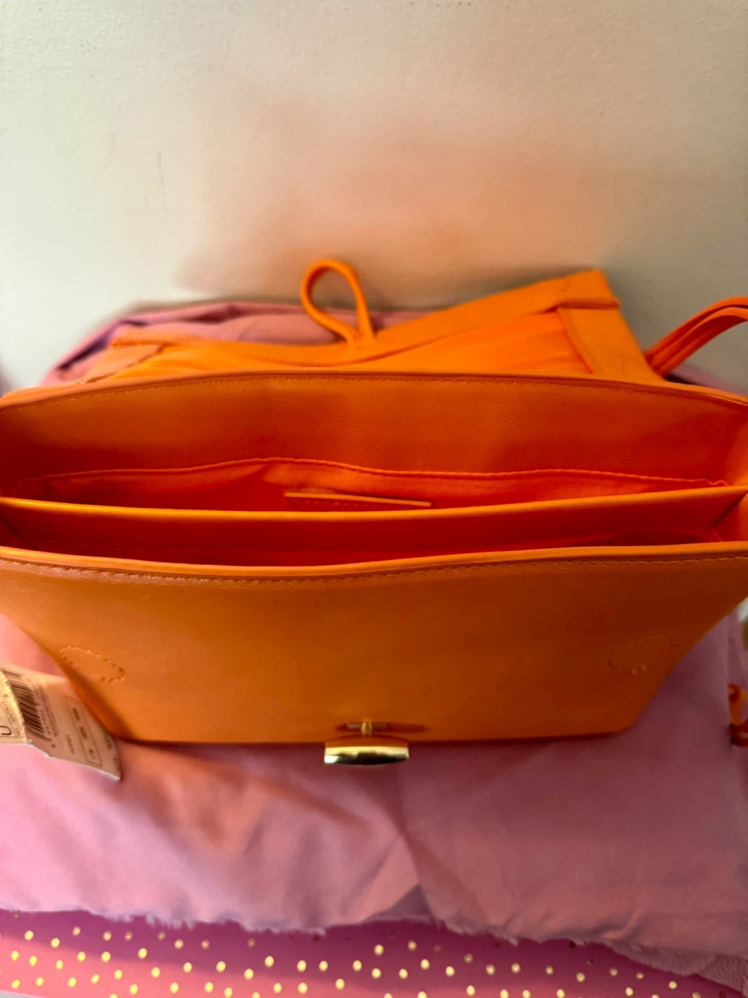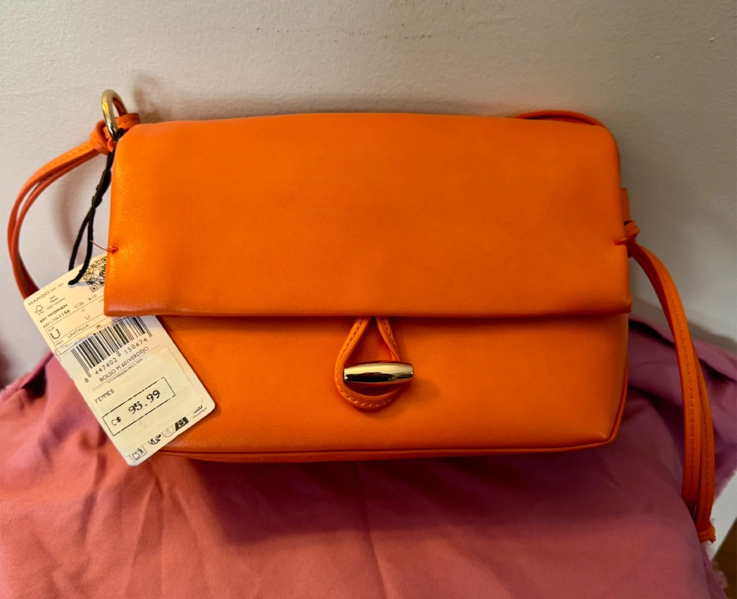 This is a Mango Bolso Messenger bag in a vibrant orange colour. It's a stylish and practical bag for everyday use! The tag shows the original price was $95.99.