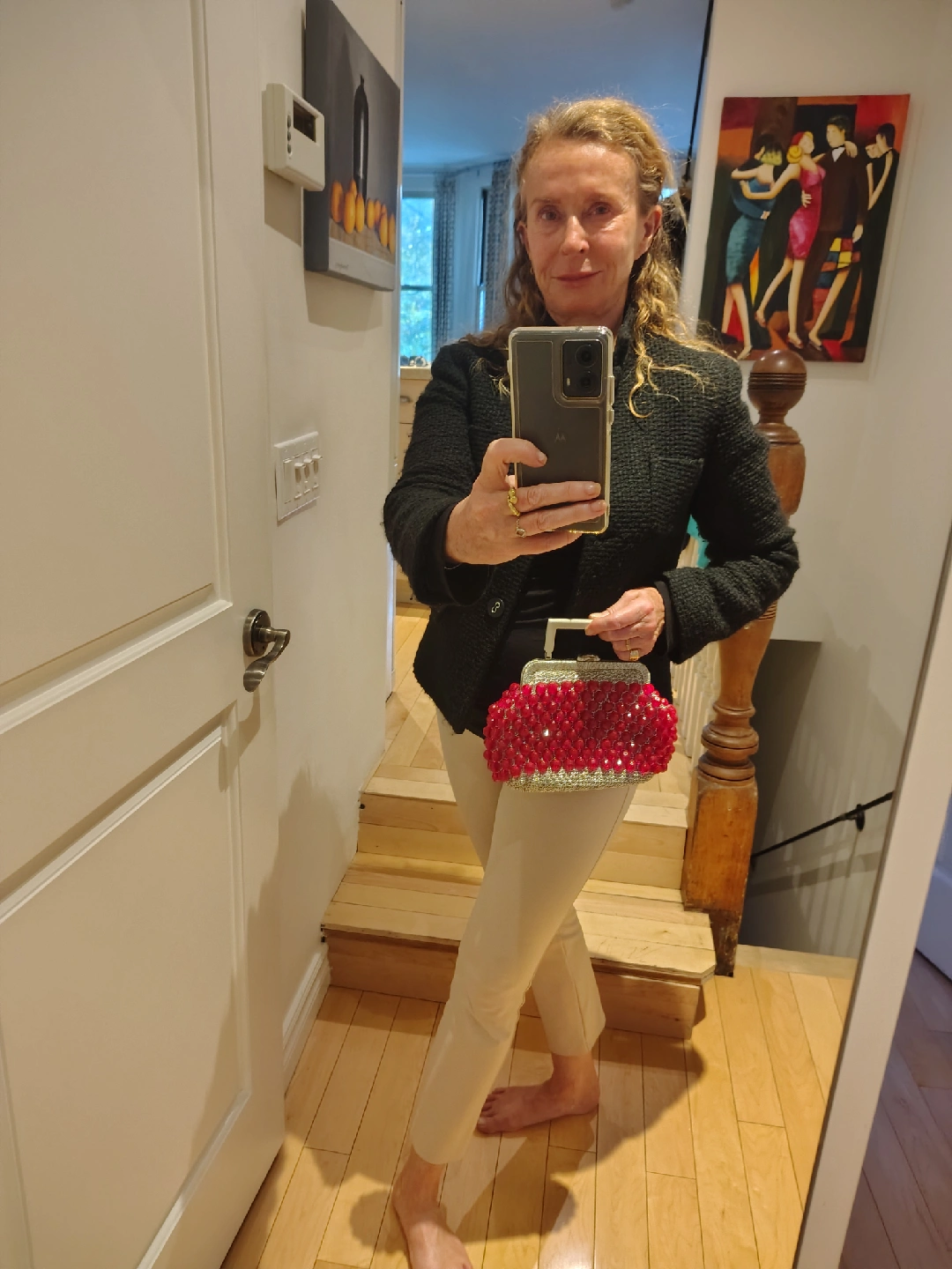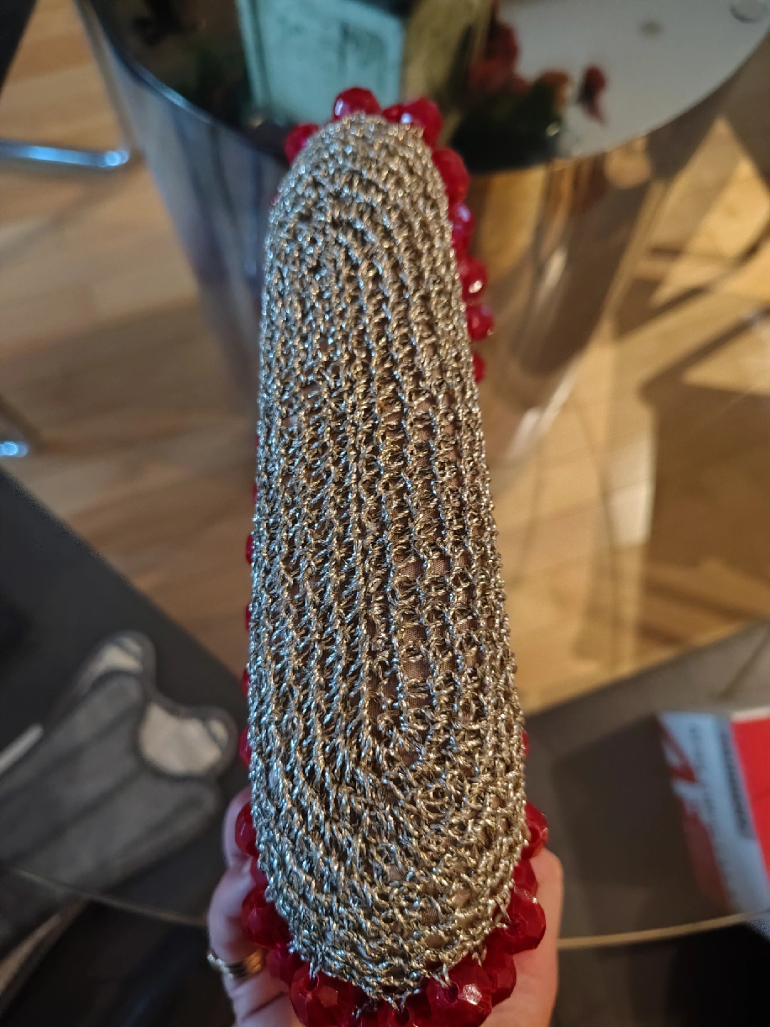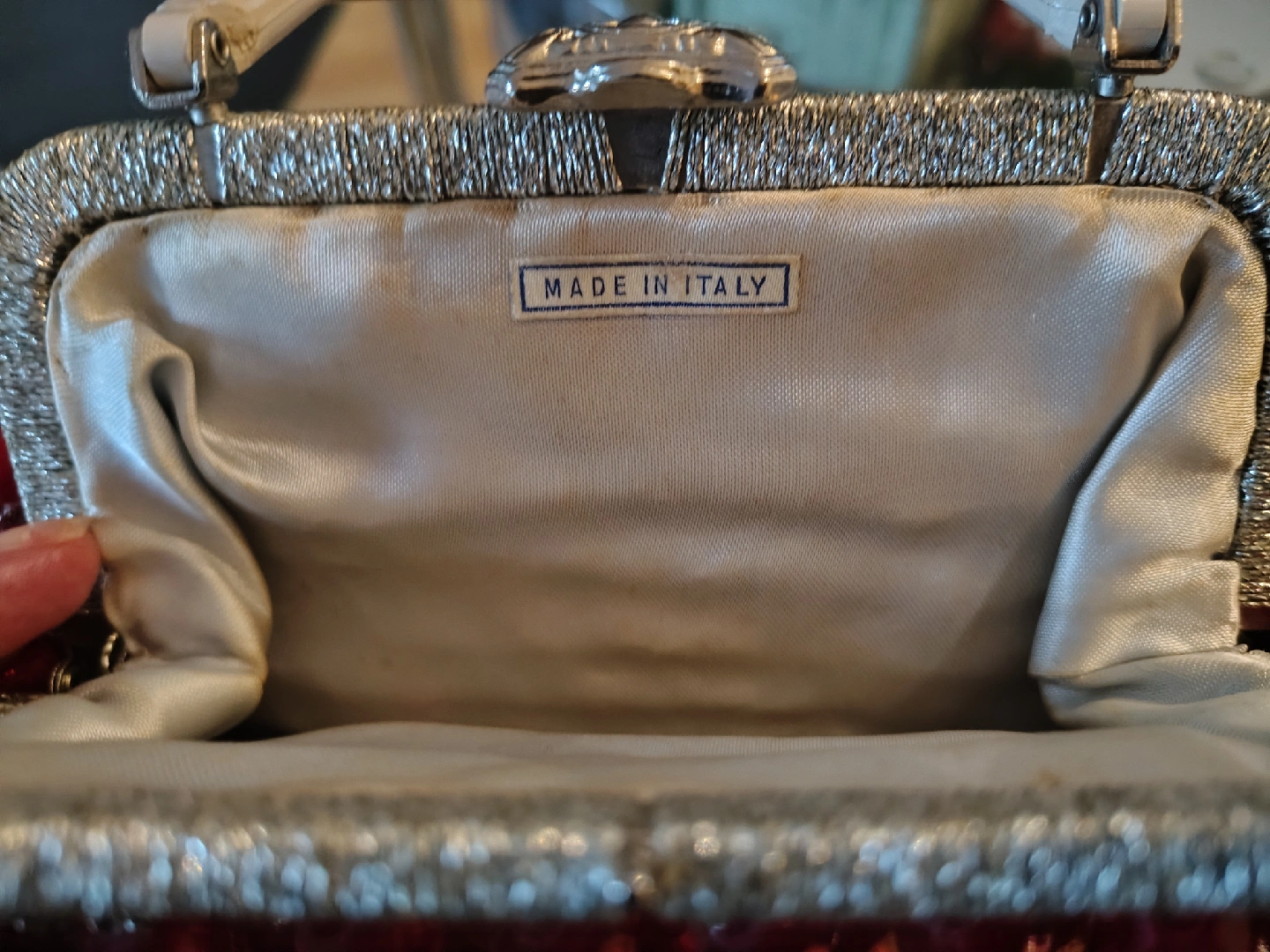 The magenta crystals are plastic yet it is tasteful and stylish. The light grey handle, clasp design plus silver threading and crochet detail are to die for. This lovely little evening bag adds a pop of colour to any outfit! The inside tag reads "Made in Italy" so you know it's a quality piece. Perfect for a night out or a special occasion. This sweet and unique (and fun!) bag has been in my collection since the early 2000s and in storage for the past 20 years. Coming out now just for you!