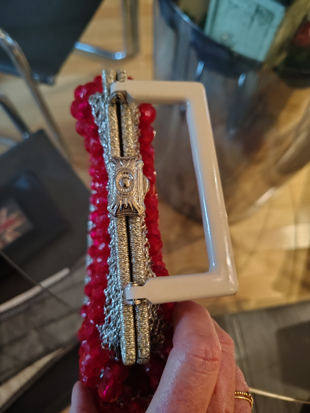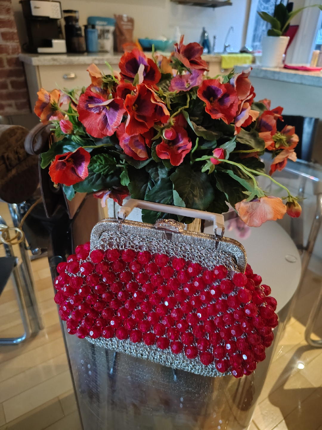 The magenta crystals are plastic yet it is tasteful and stylish. The light grey handle, clasp design plus silver threading and crochet detail are to die for. This lovely little evening bag adds a pop of colour to any outfit! The inside tag reads "Made in Italy" so you know it's a quality piece. Perfect for a night out or a special occasion. This sweet and unique (and fun!) bag has been in my collection since the early 2000s and in storage for the past 20 years. Coming out now just for you!