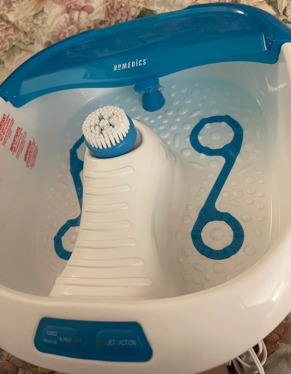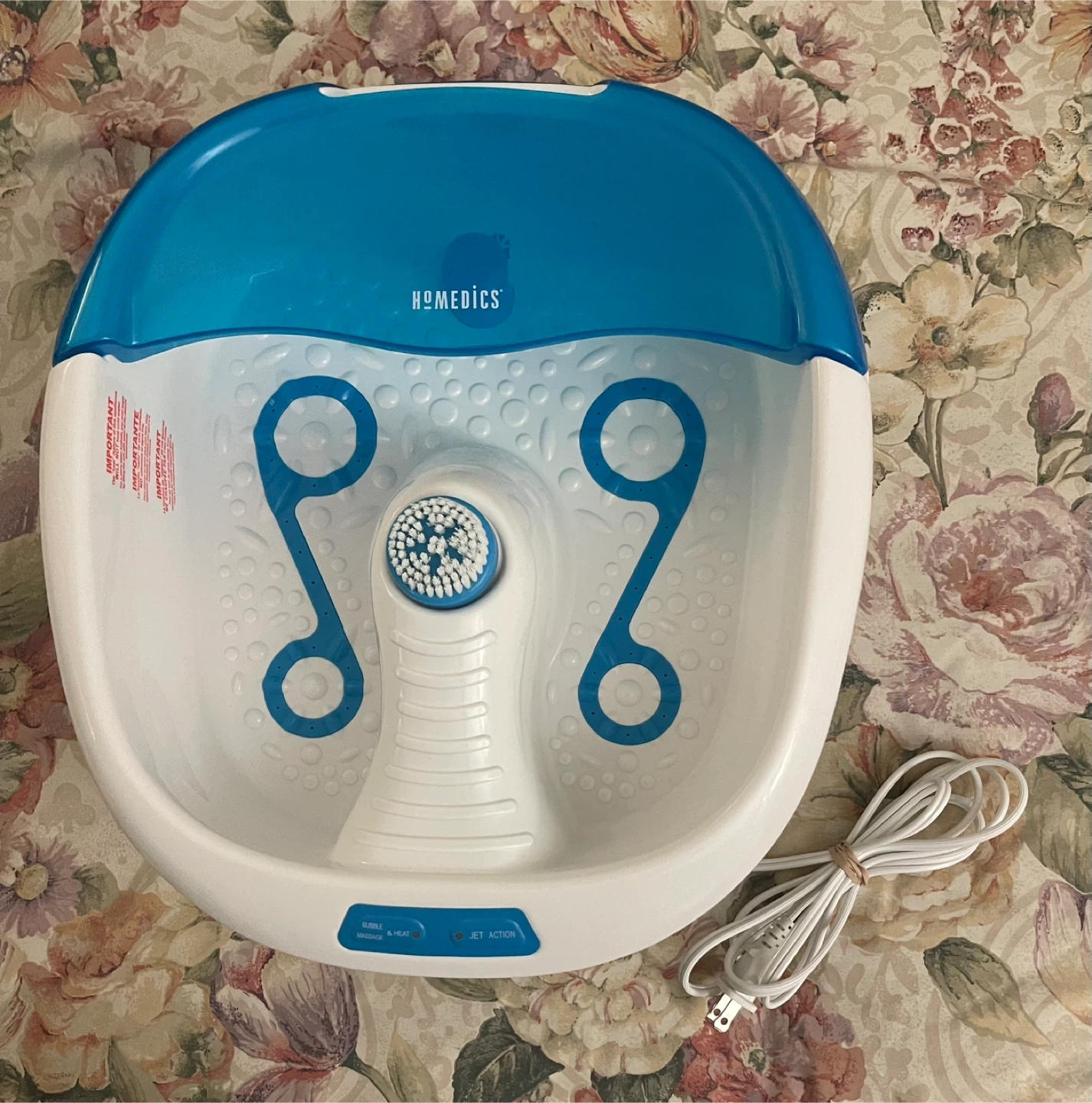 HoMedics Bubble Bliss Deluxe Foot Spa. It features bubble massage and splash functions, and includes a removable toe brush. This unit has jet action for a relaxing experience. Excellent condition, rarely used. From smoke-free, pest-free, and pet-free home.