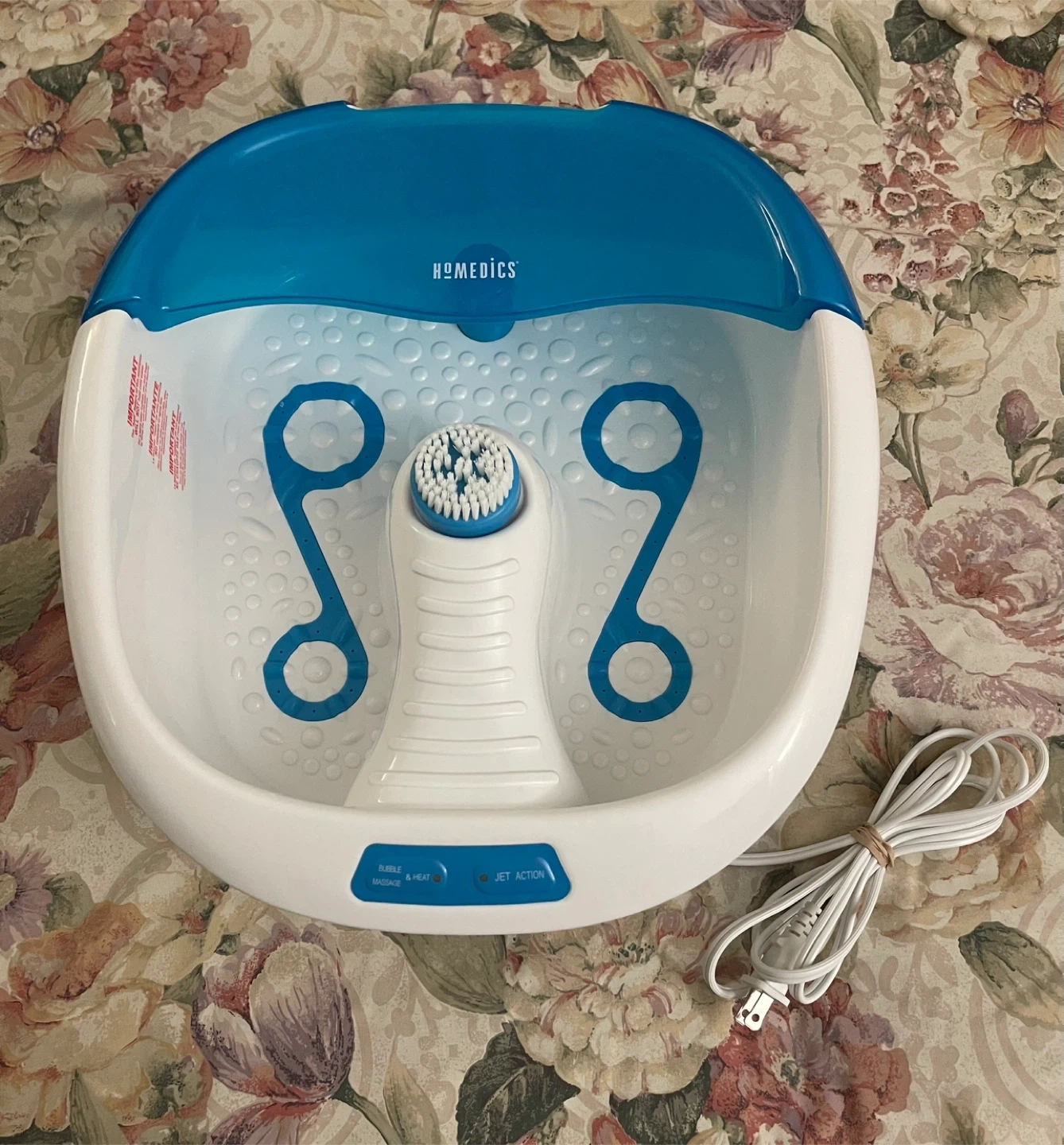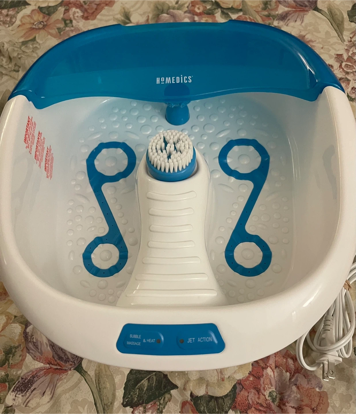 HoMedics Bubble Bliss Deluxe Foot Spa. It features bubble massage and splash functions, and includes a removable toe brush. This unit has jet action for a relaxing experience. Excellent condition, rarely used. From smoke-free, pest-free, and pet-free home.