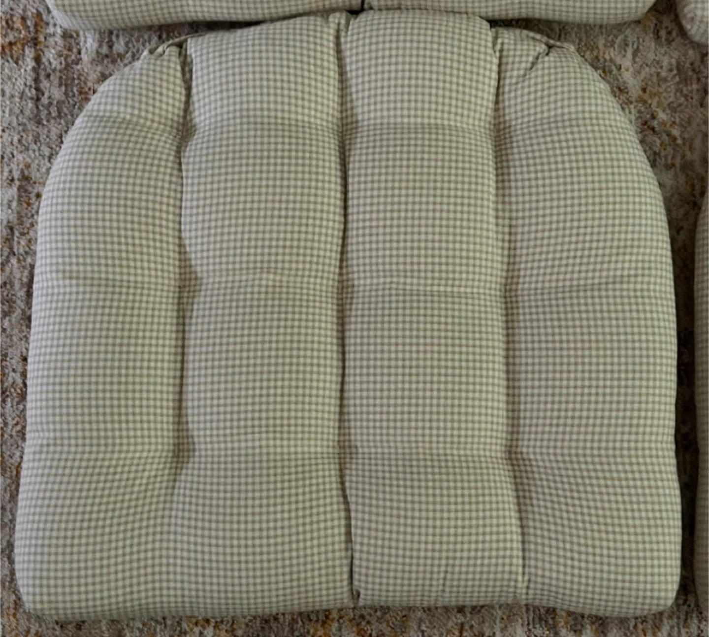 82Selling a set of four Barnett Home Decor Madrid dining chair pads! These are in a neutral gingham pattern and made of 100% cotton. They're the medium size with a latex foam fill. They also have ties to keep them securely in place. Extremely comfortable and durable. Machine washable and made in the USA. Selling the set of 4 for $40. These were purchased for $40 each.