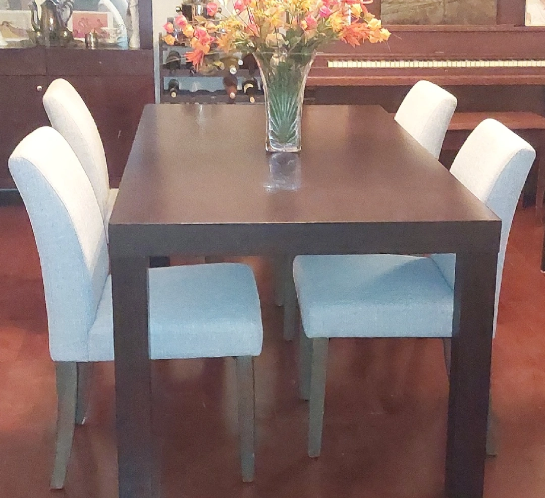 71Set of four dining chairs in good condition. The chairs are upholstered in a light grey fabric and have brown wooden legs. They measure approximately 34 inches in height floor to top of back of chair, and 19 inches from floor to seat. Will also add the table in the photo, but when it was moved a leg was damaged. If you are handy it is a great extra long table (6 x 3 feet).