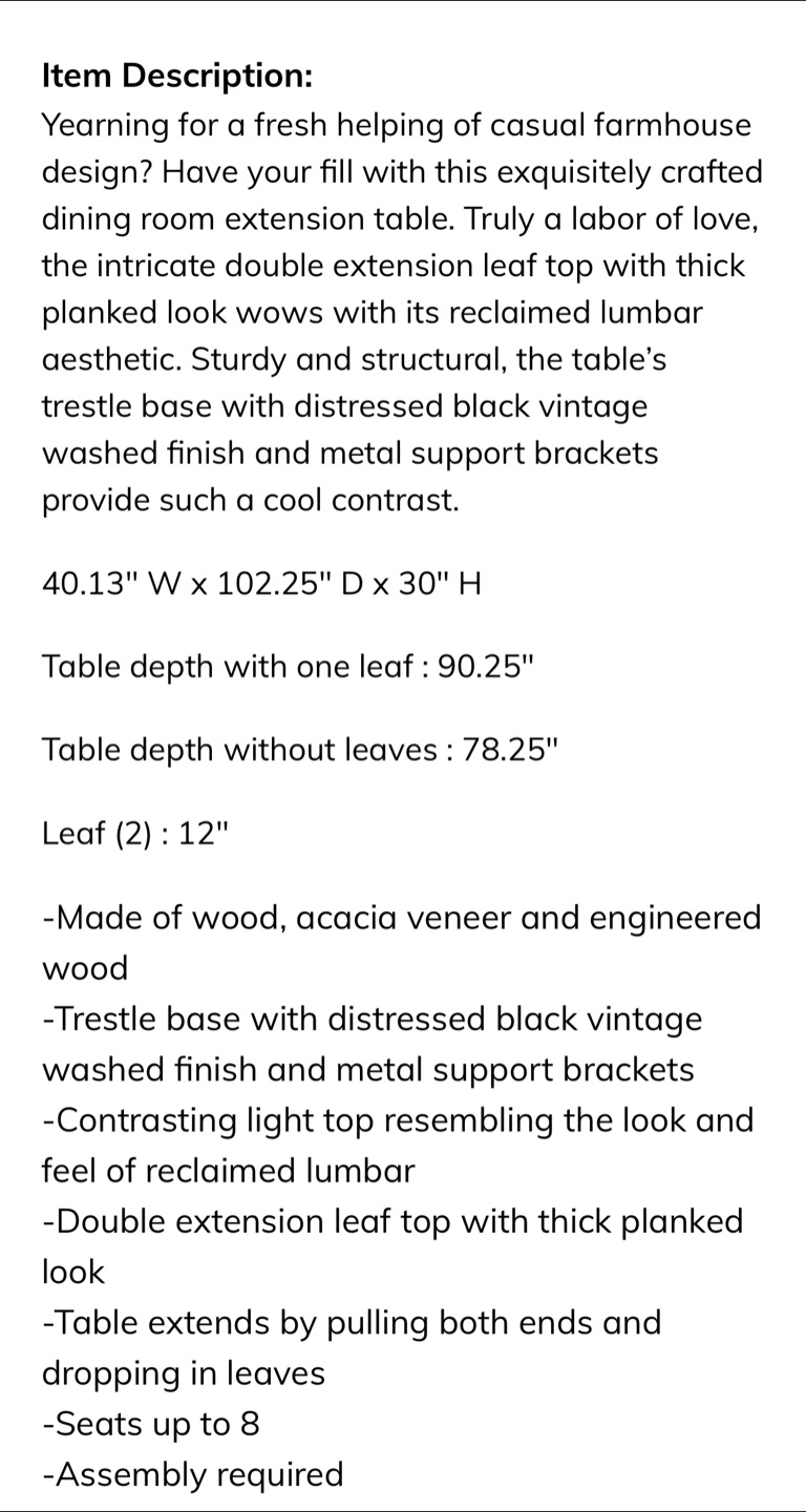 99Selling a beautiful dining room set that includes an extension table and six chairs. The table features a double extension leaf top with a thick planked look, giving it a reclaimed lumber aesthetic. The trestle base has a distressed black vintage washed finish with metal support brackets. The table's dimensions are approximately 40.13" W x 102.25" D x 30" H. With one leaf, the table depth is 90.25", and without leaves, it's 78.25". Each leaf adds 12" to the table length. It seats up to 8 people