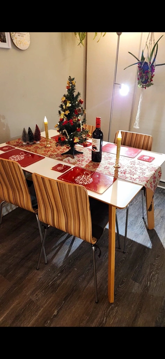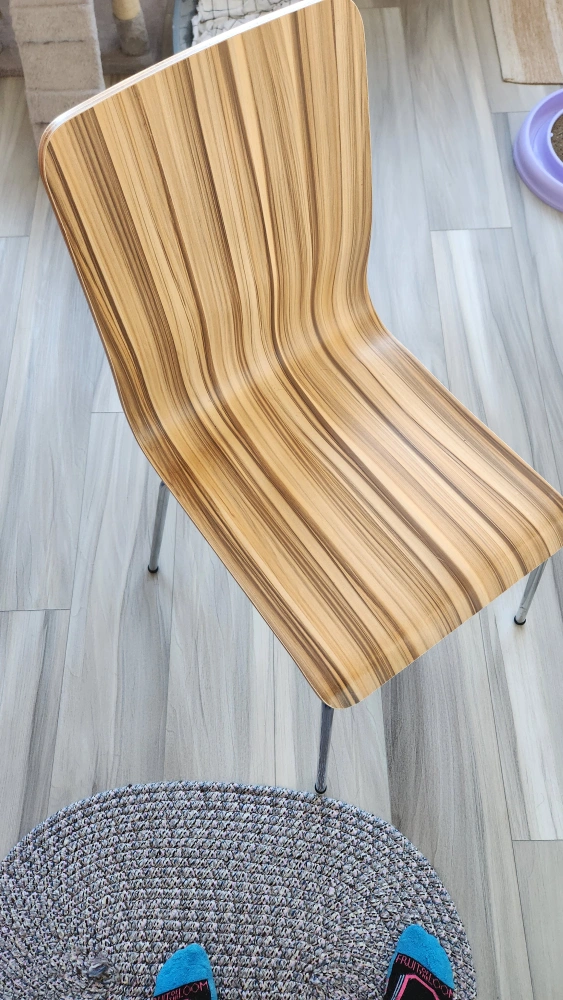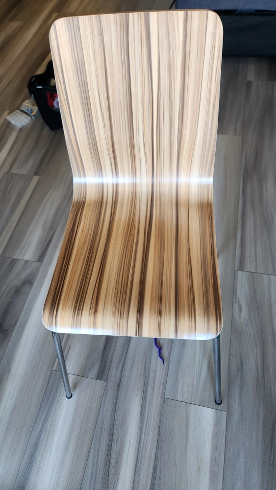 Set of 4 dining chairs with a wood and metal frame. Striped veneer on the back and seat. Good condition.