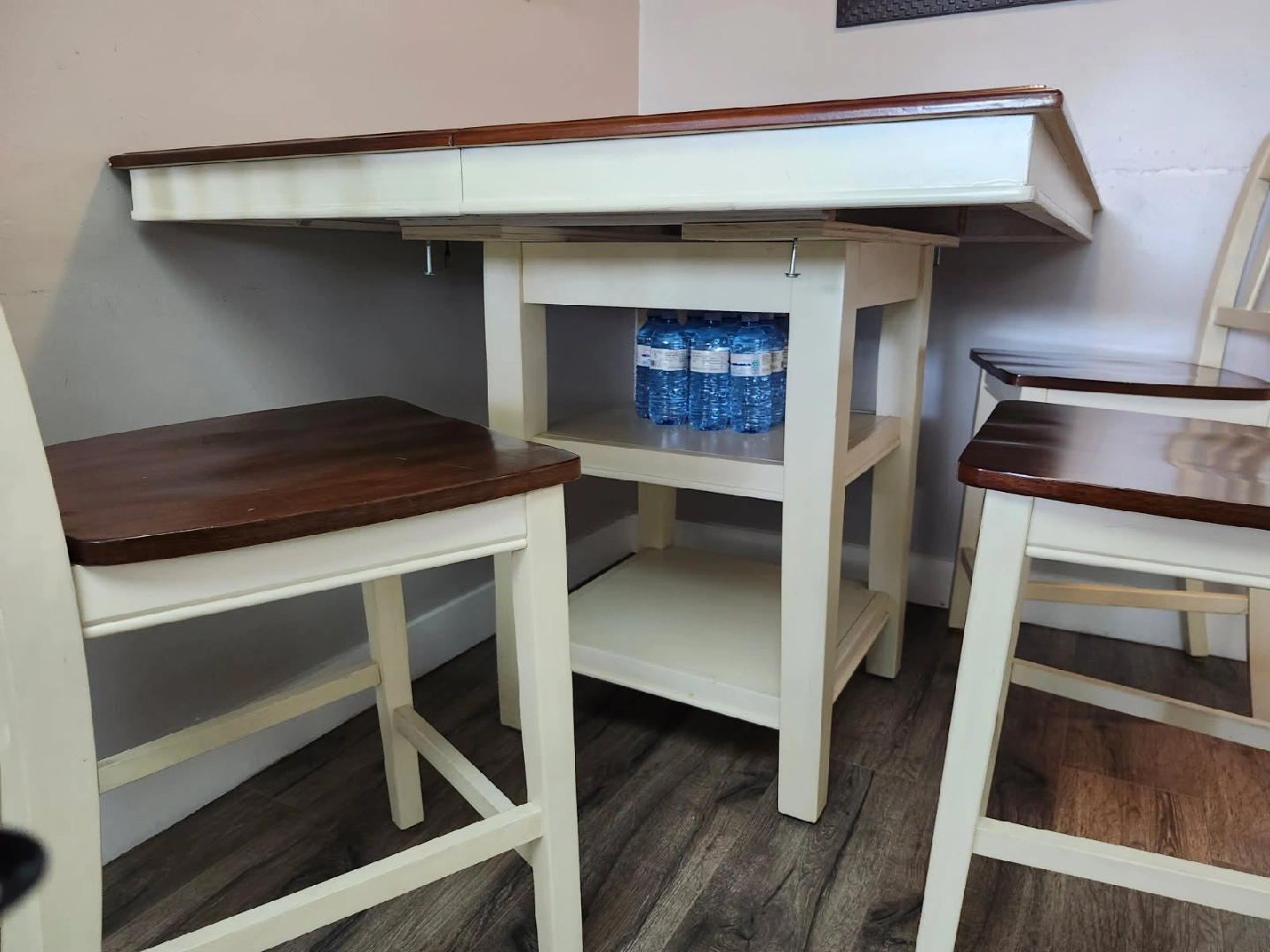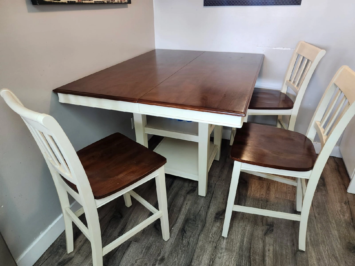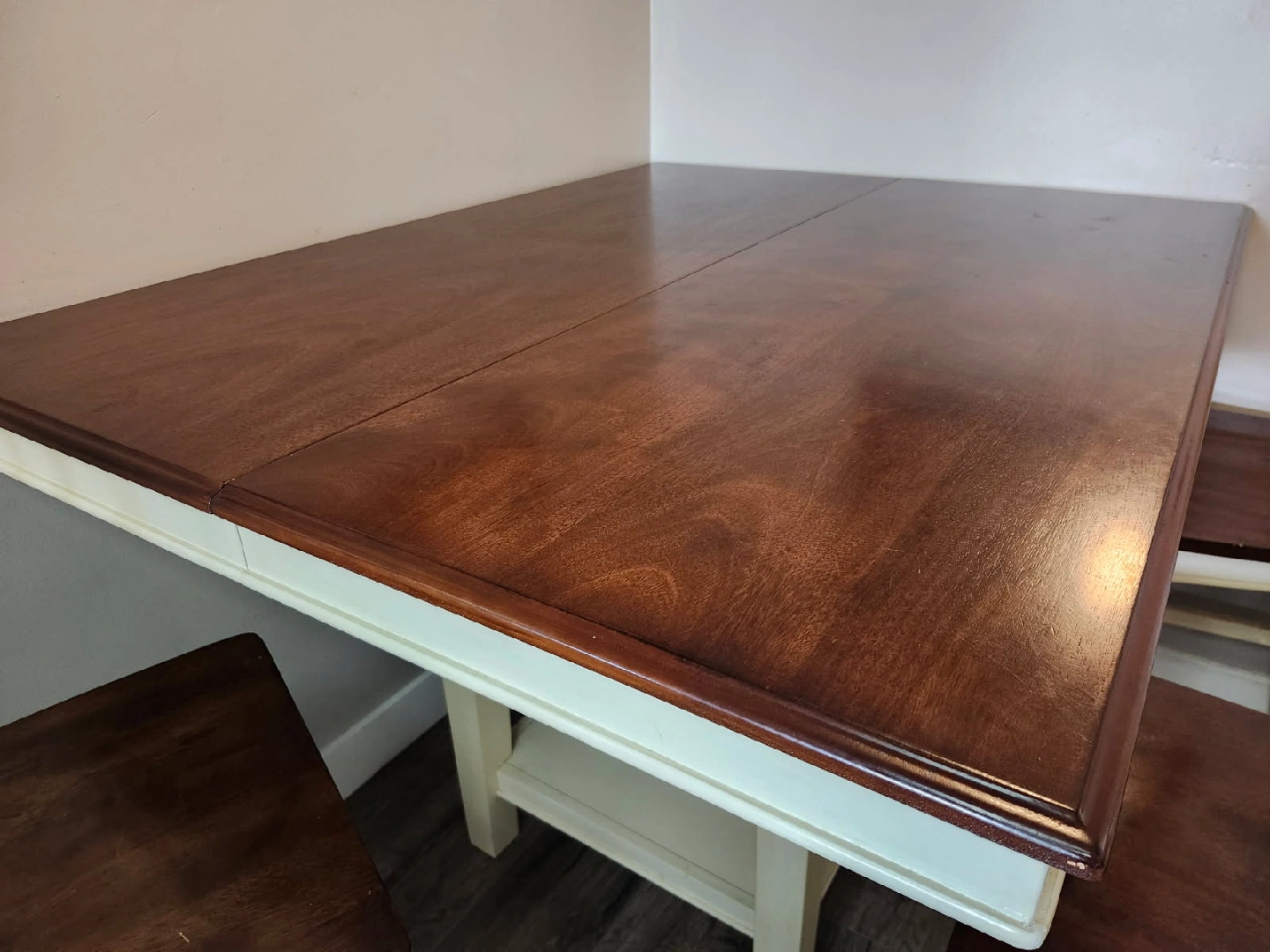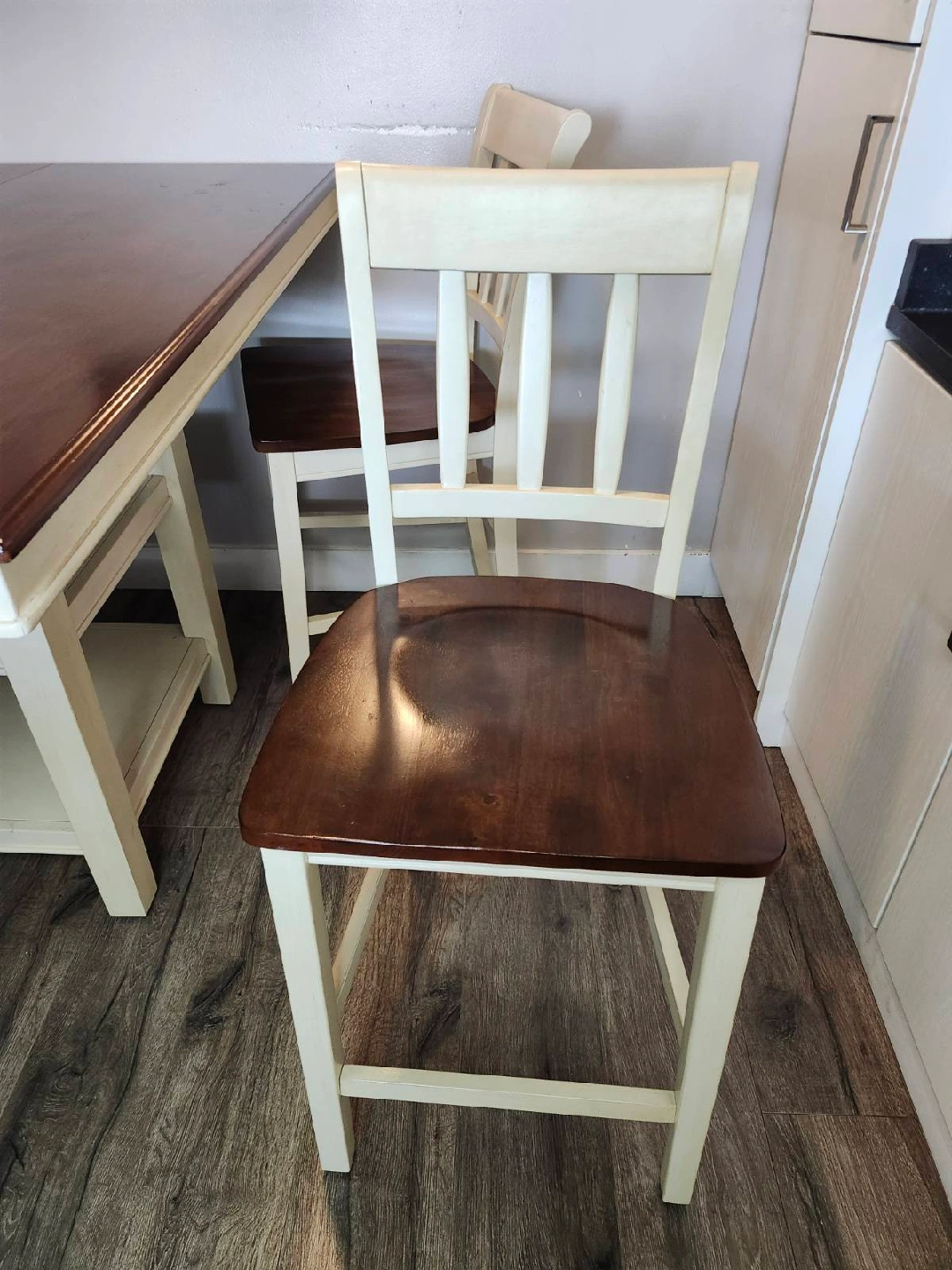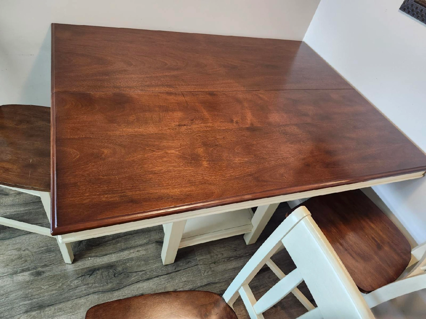 Selling a dining table with four chairs. The table features a dark wood top with a cream-colored base. The chairs are also a matching dark wood and cream colour. It's a great set for a smaller dining area! 54 x 42 without leaf. Comes with leaf to make it bigger. Height 36. 6 chairs. Height 41 with backrest and sit at 24 inches.