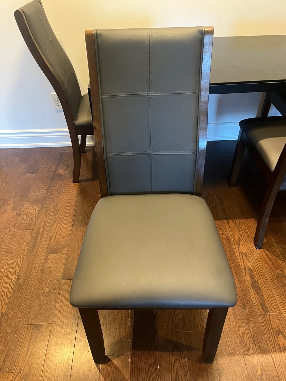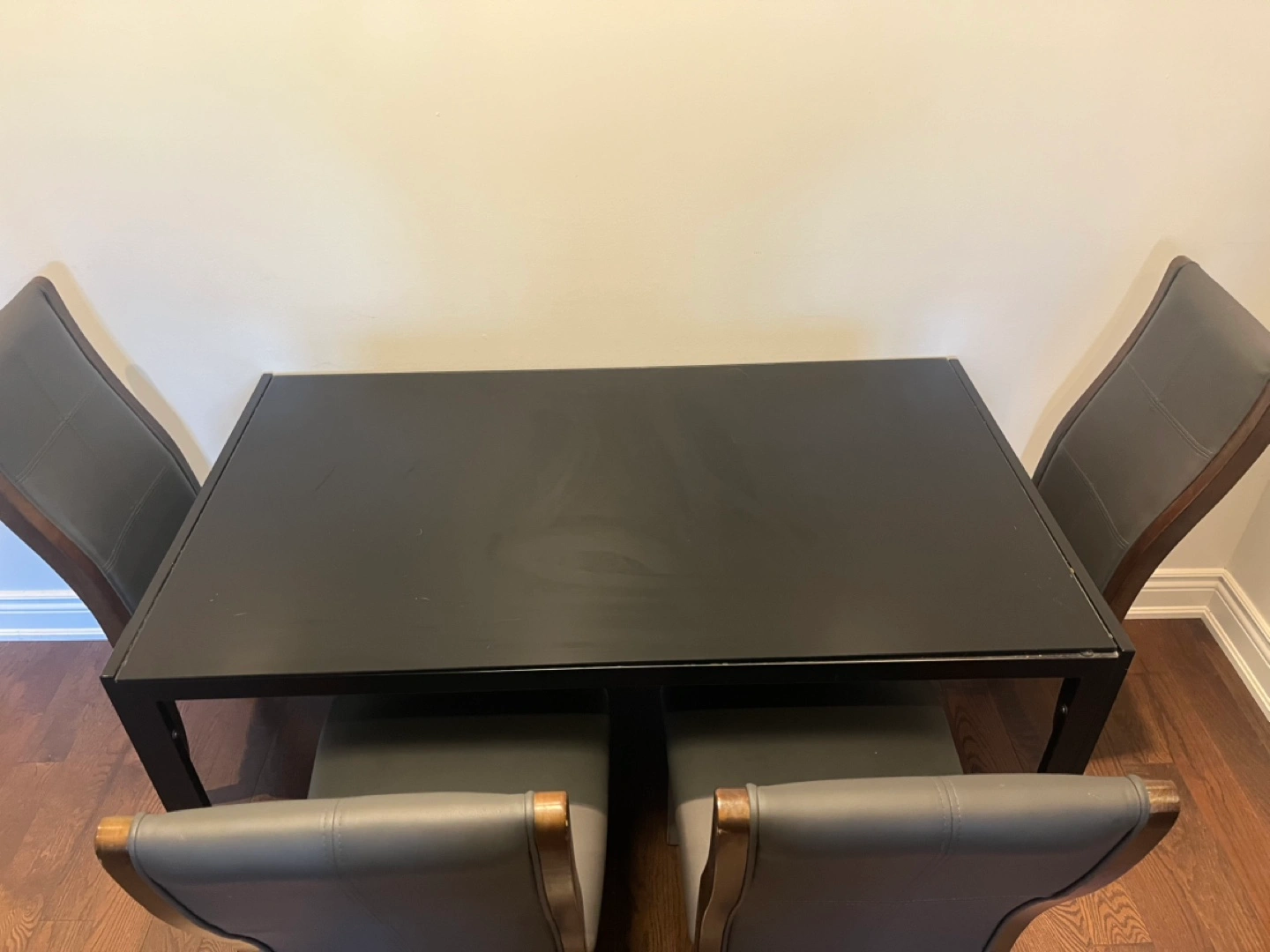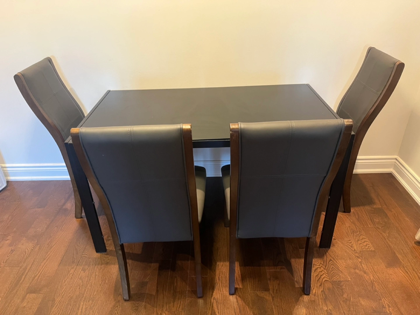 5Black glass table top with metal legs and four matching chairs with dark grey faux leather seats and wooden backs. Need sold asap!