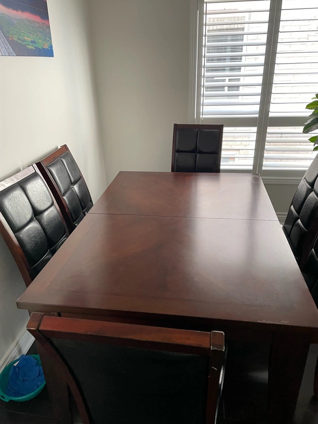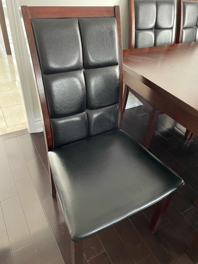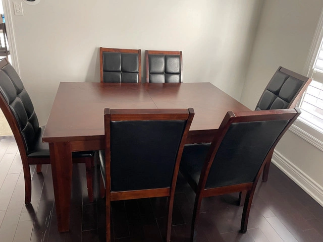 Dark brown wooden dining table with six black leather chairs. Table dimensions Length - 60” expandable 1 foot Width - 41” Height-29” In good condition used very less. Moving out sale See my other listing.