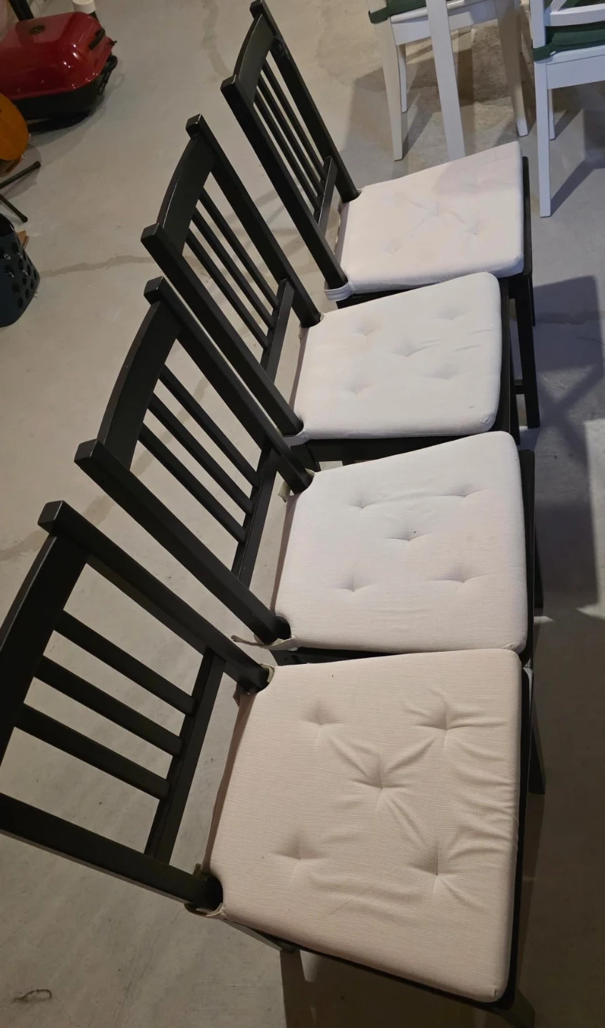 10Selling a dining table set that includes a black table and four chairs. The chairs have white cushions. It's a great set for a small dining area or kitchen!