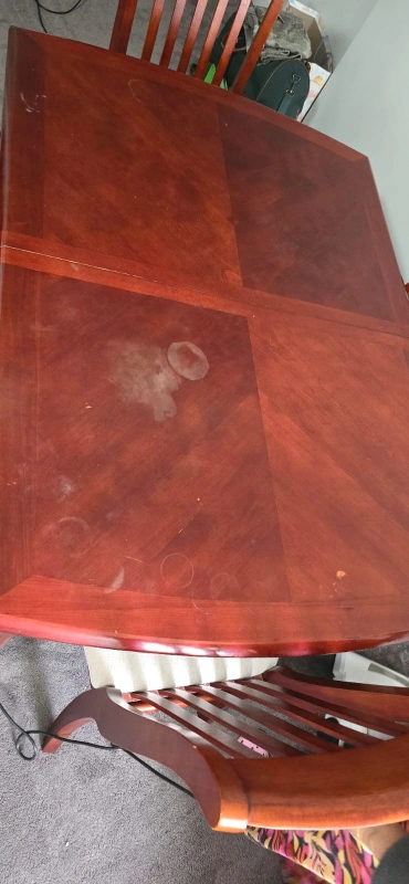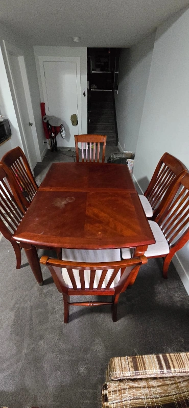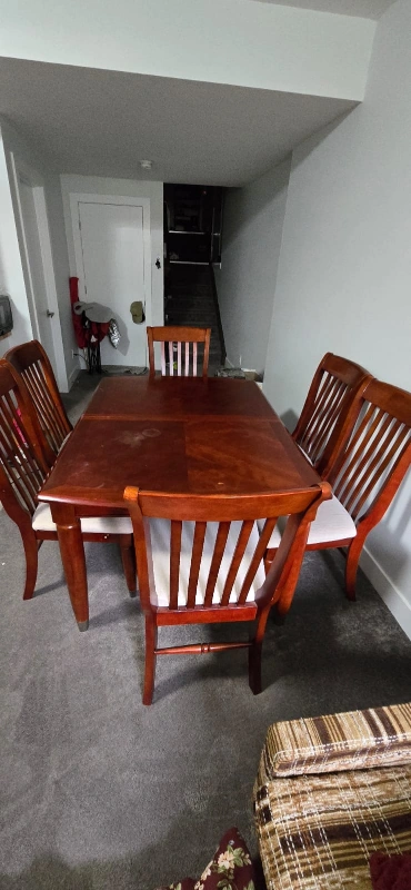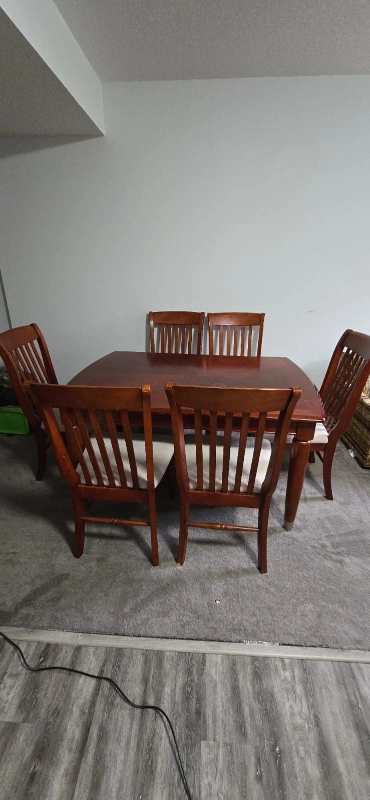 10Wooden dining table with 6 chairs. Table has a leaf.